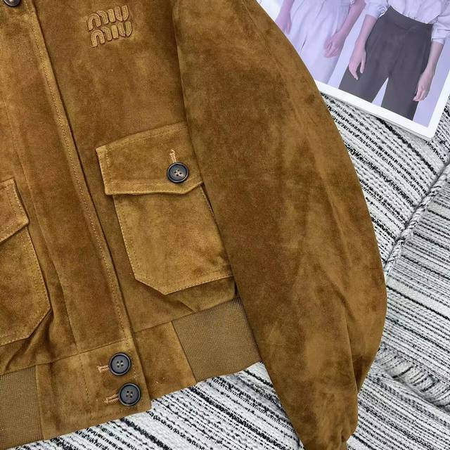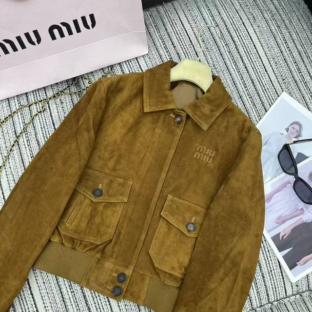 Highly recommended Exclusive debut of the 25th anniversary early autumn series Miu* newest exclusive custom suede suede craft lapel long-sleeved short leather jacket coat super good-looking foreign color letter embellishment large pockets Yb1:1 custom Sml