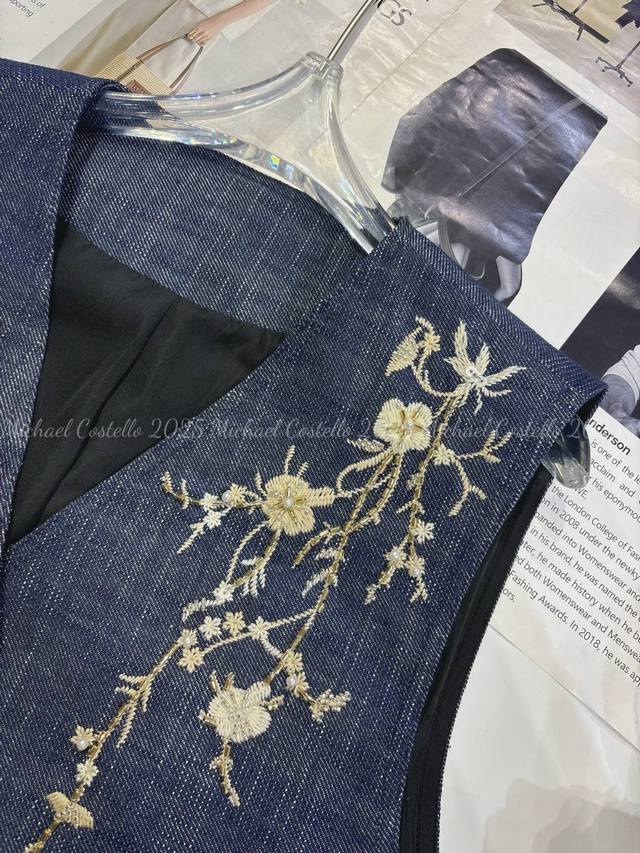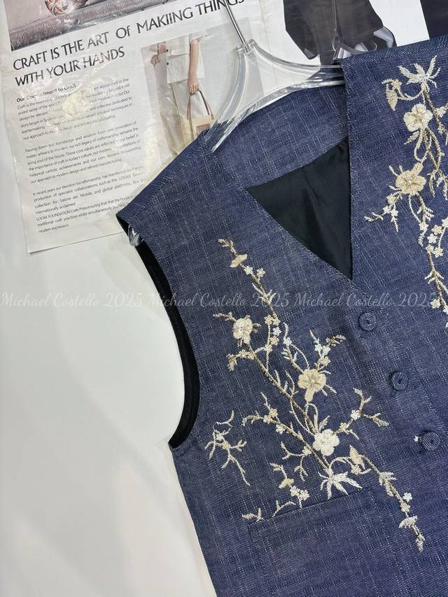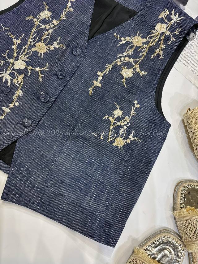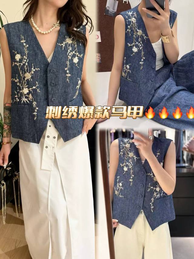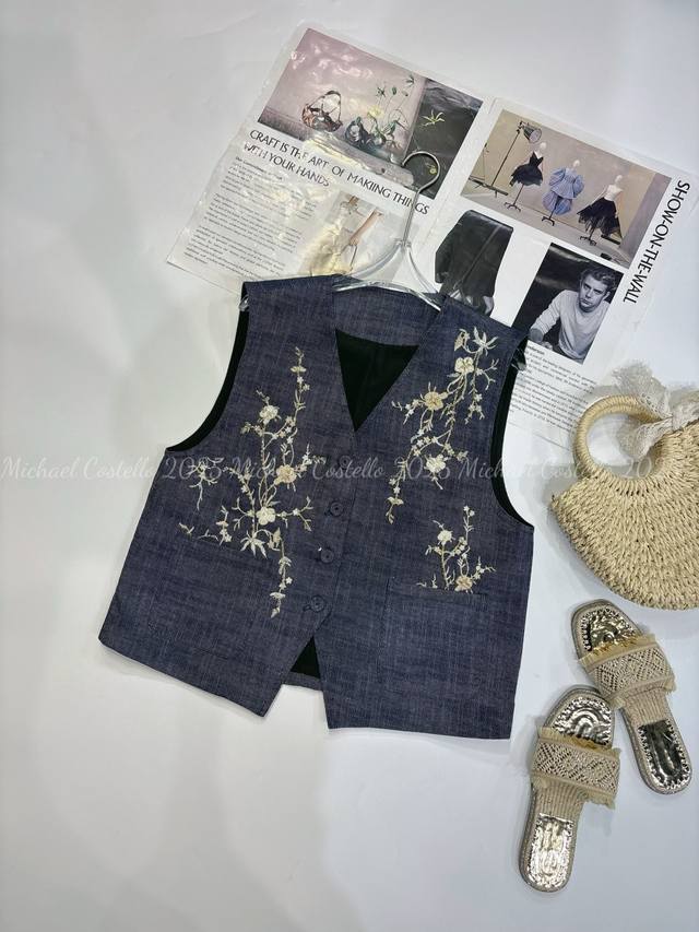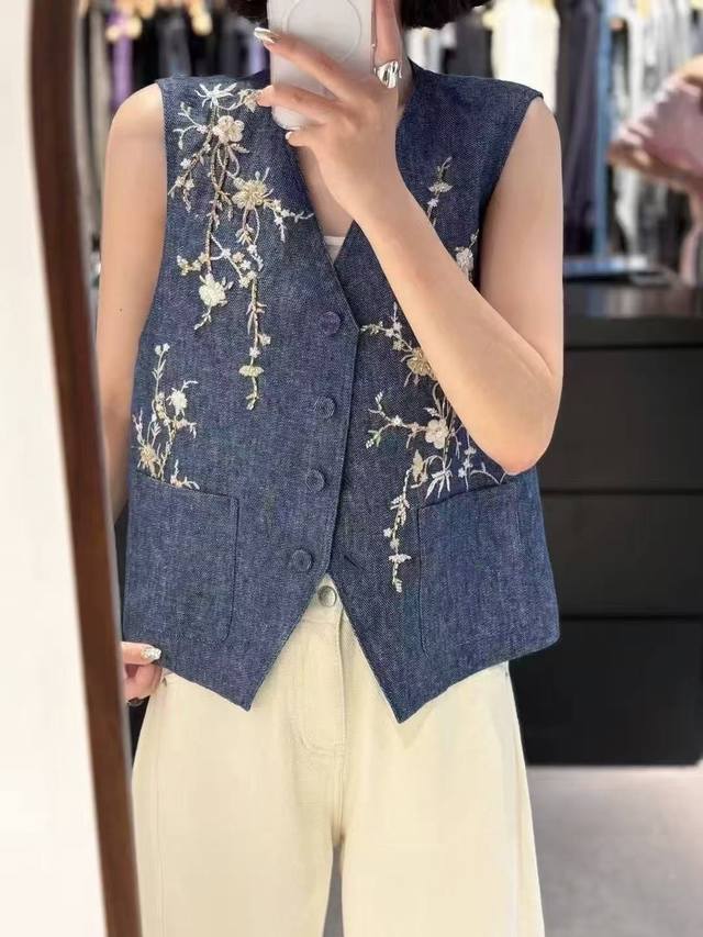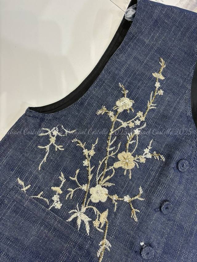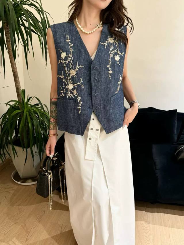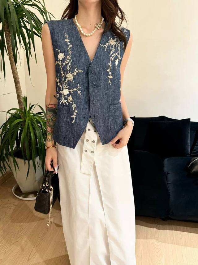 High-quality, heavily beaded, and beautiful denim vest. Dyed in classic cow blue with a retro filter, this vest is a true fashion statement. Every stitch of the exquisite floral embroidery exudes romance and poetry. The neat sleeveless design is stunning when worn alone or layered, creating a casual and effortless look while also creating a sense of layering and effortlessly capturing the atmosphere. Smlxl