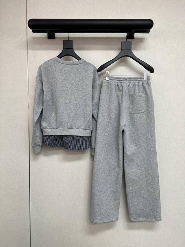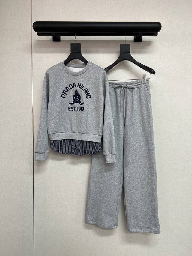 High-quality Prada* 2025 autumn/winter new style suit. Round-neck, two-piece sweatshirt and wide-leg pants. Top with a logo pattern embroidered with thick thread. Exquisite, three-dimensional hem with checkered fabric for a layered look. Heavyweight cotton sweatshirt with excellent texture. Fleece base for warmth. Soft and comfortable. Two colors. Sml.