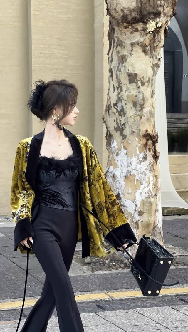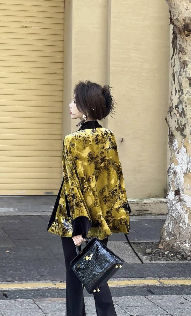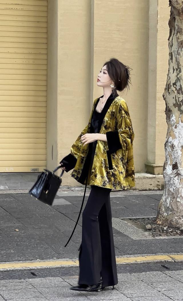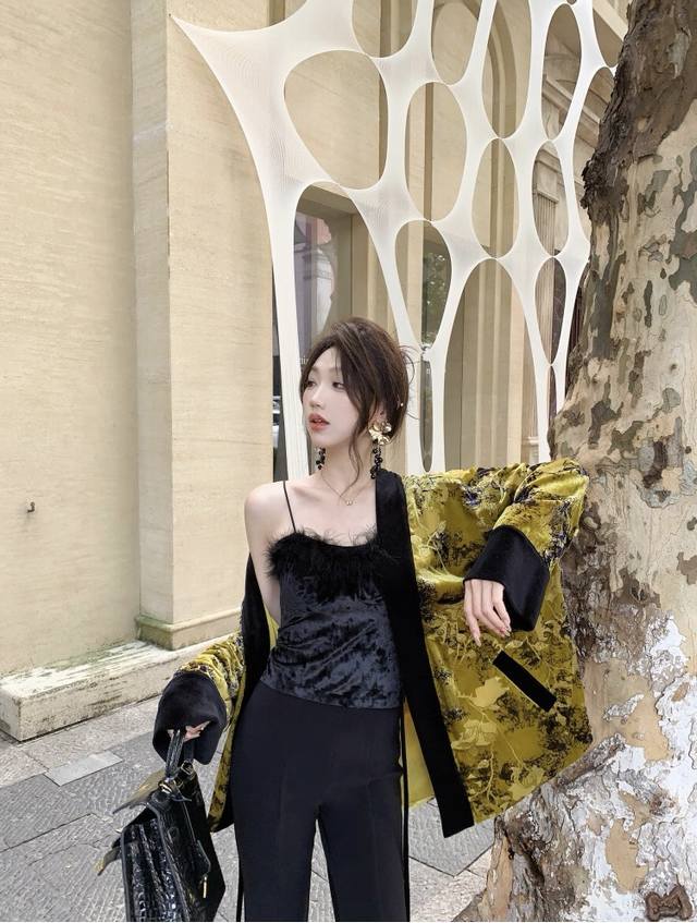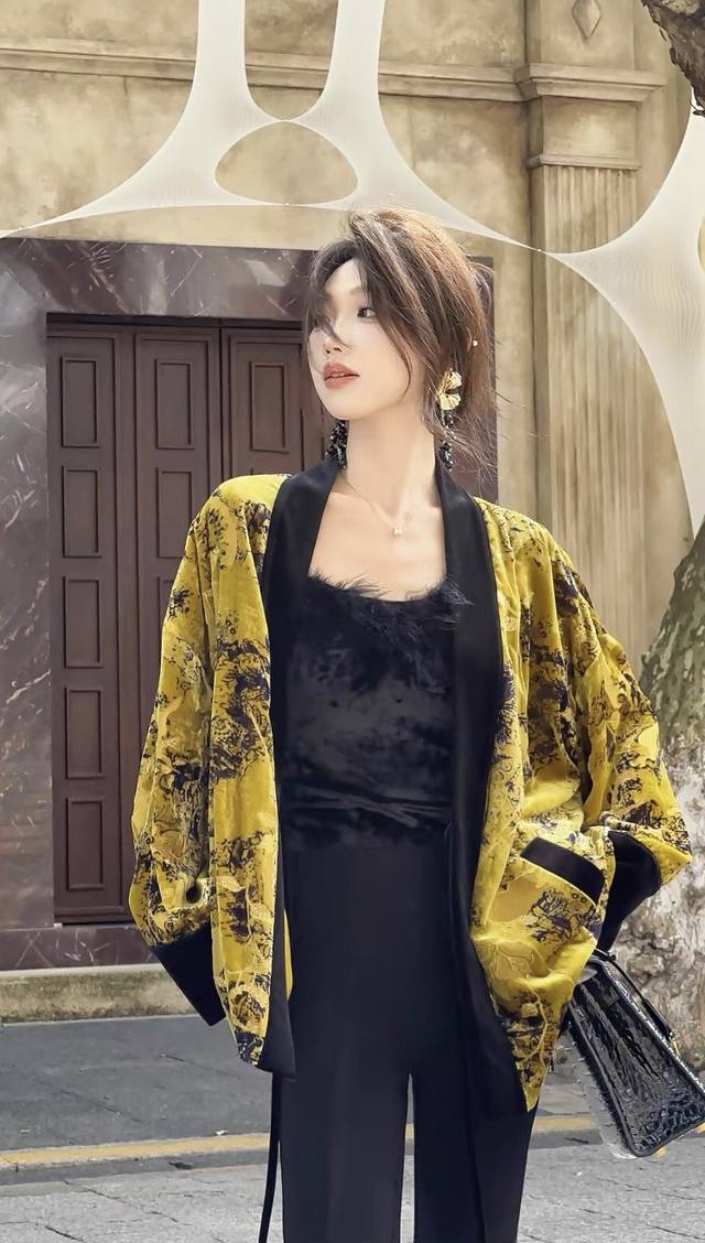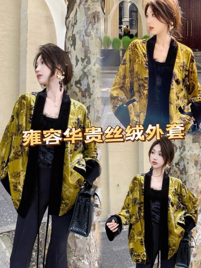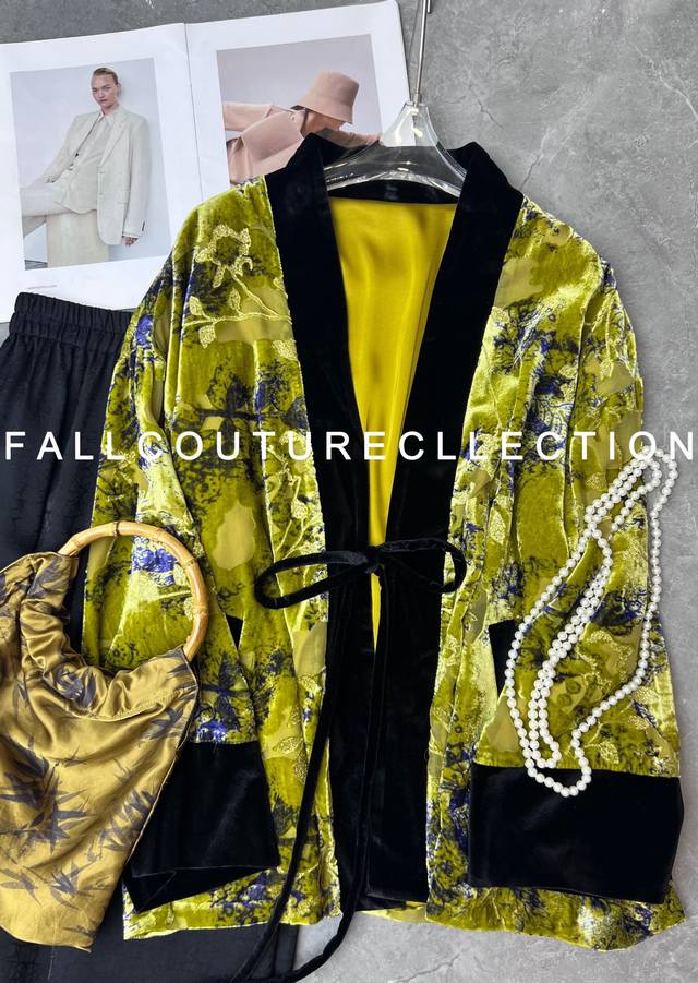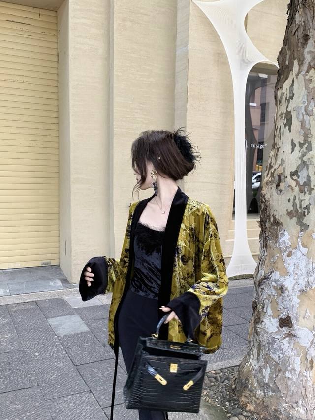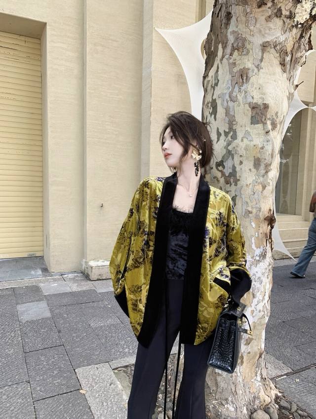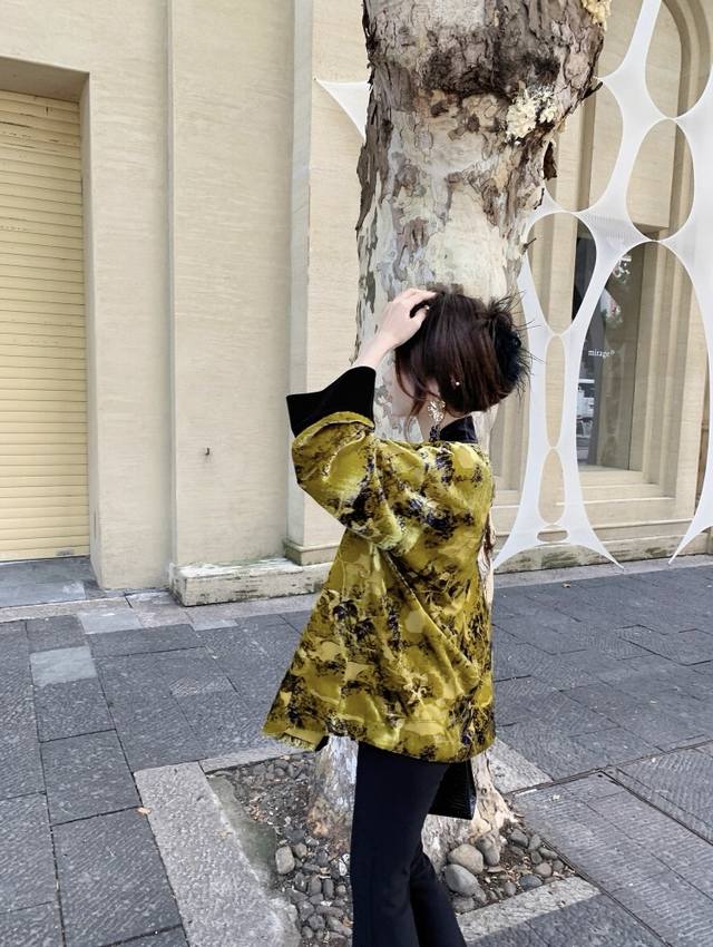 High-quality textured heavy-duty burnt velvet jacket. The color-blocked lace-up design details exude a classic and calm elegance. The loose version is not picky about body shape, and the overall upper body is noble and extraordinary. Smlxl