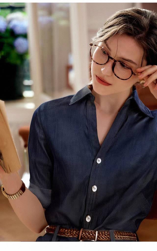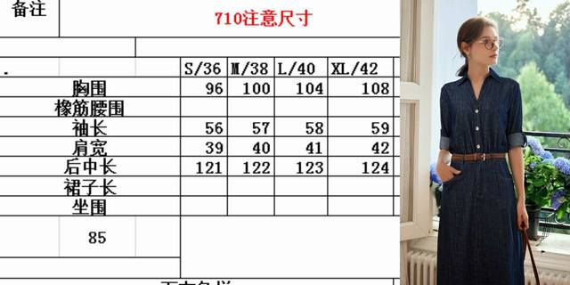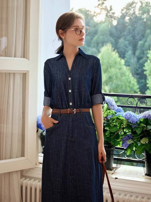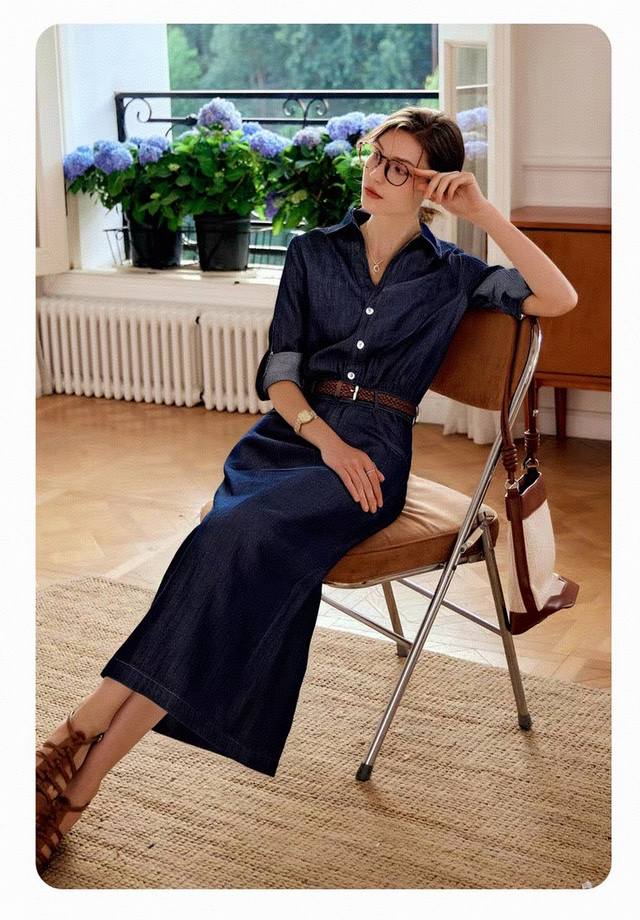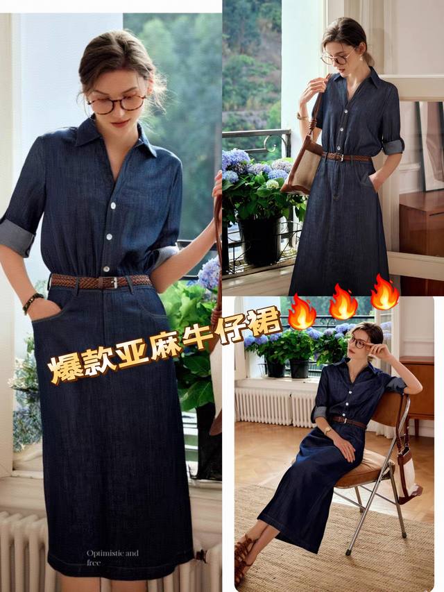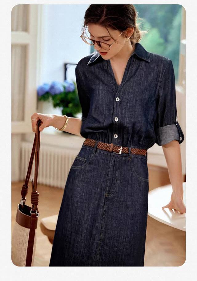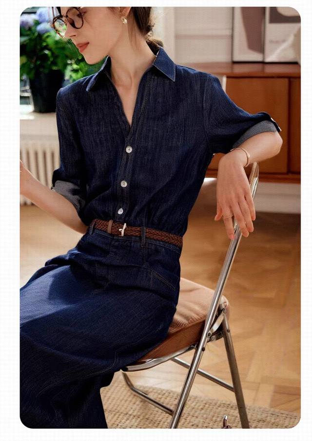 Hot item! High-end linen fabric! A chic blue, slim-fitting denim dress with thr