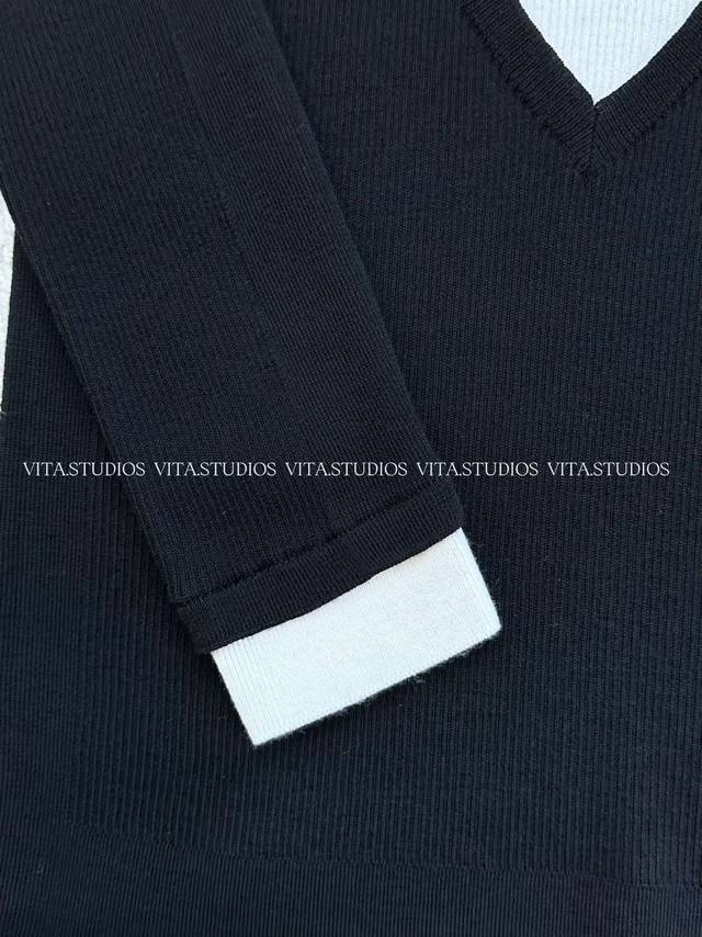 Hot Item In Stock DDD Ddd Faux Two-Piece Turtleneck Knitwear Ddd Made of 80-count 100% wool fabric Ddd The softness of wool gives the knitwear a delicate and skin-friendly feel Ddd Wool's excellent warmth Ddd Crafted with an 18-needle ultra-fine ribbed knitting process Ddd The extremely fine 18-needle count means that the weave density per inch is far greater than that of conventional knitwear Ddd It requires extremely high precision in knitting machines, as well as high eyesight and hand speed from the sewing workers Ddd The ribbed texture is three-dimensional and elastic Ddd When worn, it fits like a second skin without any sense of restriction Ddd The black V-neck knitwear and white turtleneck inner layer are made with a one-piece molding process Ddd The black and white splicing at the neckline and cuffs Ddd The classic black and white color blocking is highly recognizable Ddd The white double C embroidered logo on the back is hand-embroidered with three-dimensional precision aligned with the knit texture DDD Color: Black Ddd Size: SML Ddd C*Sy DDD