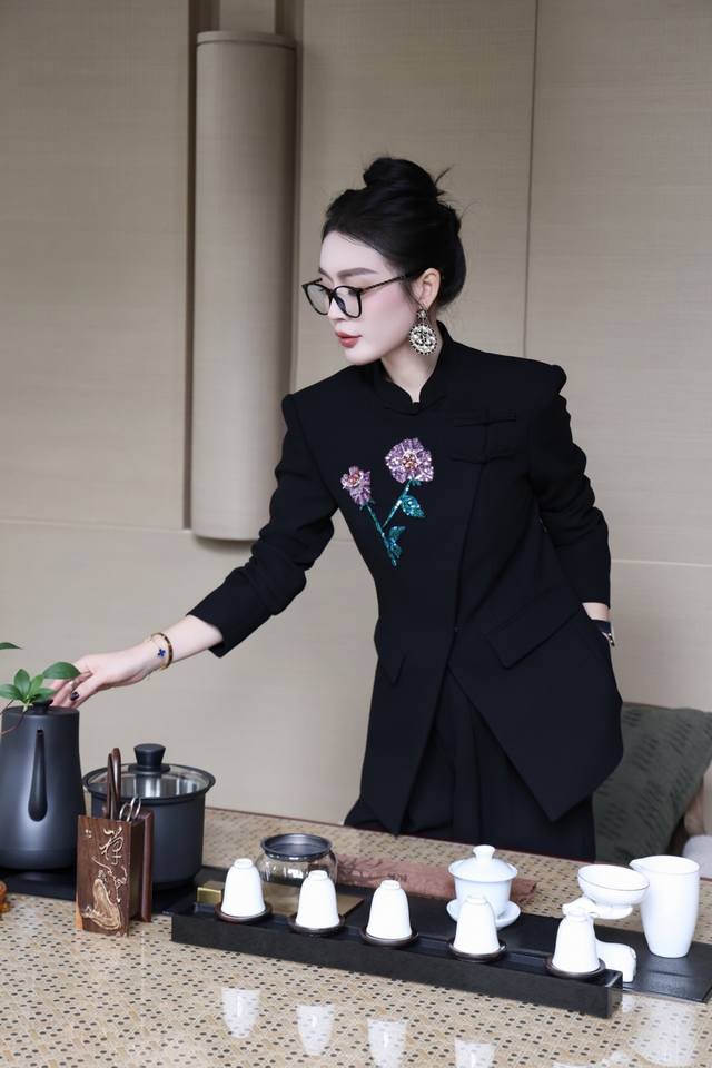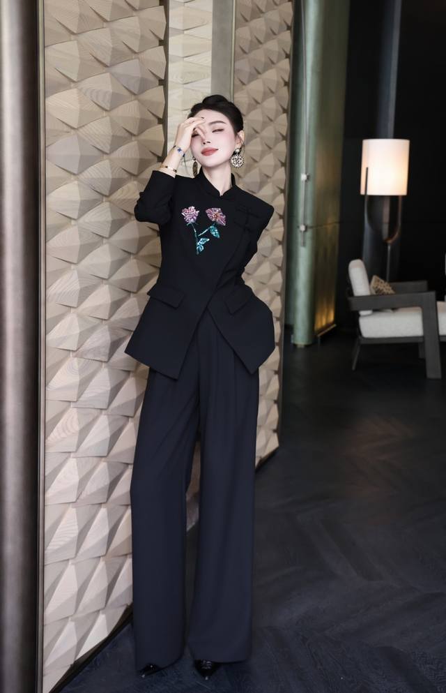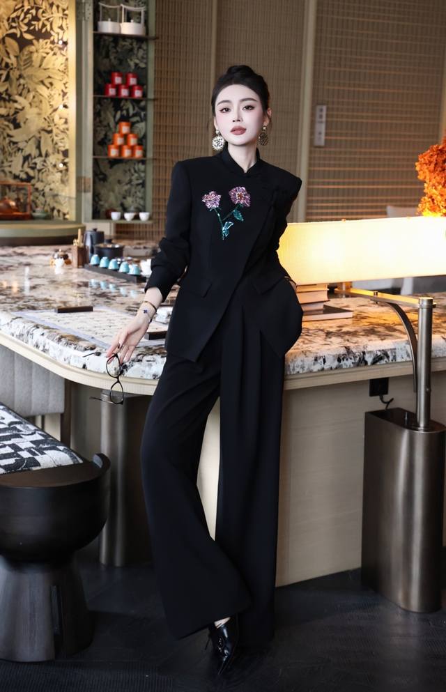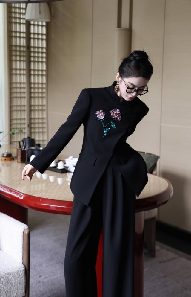 Hot item recommendation Heavy sequin embroidery Chinese style suit Heavy sequin embroidery, with ingenuity carving brilliant colors, top noble, bottom pants cool, hard and soft, wear a Chinese modern aura SML Xl