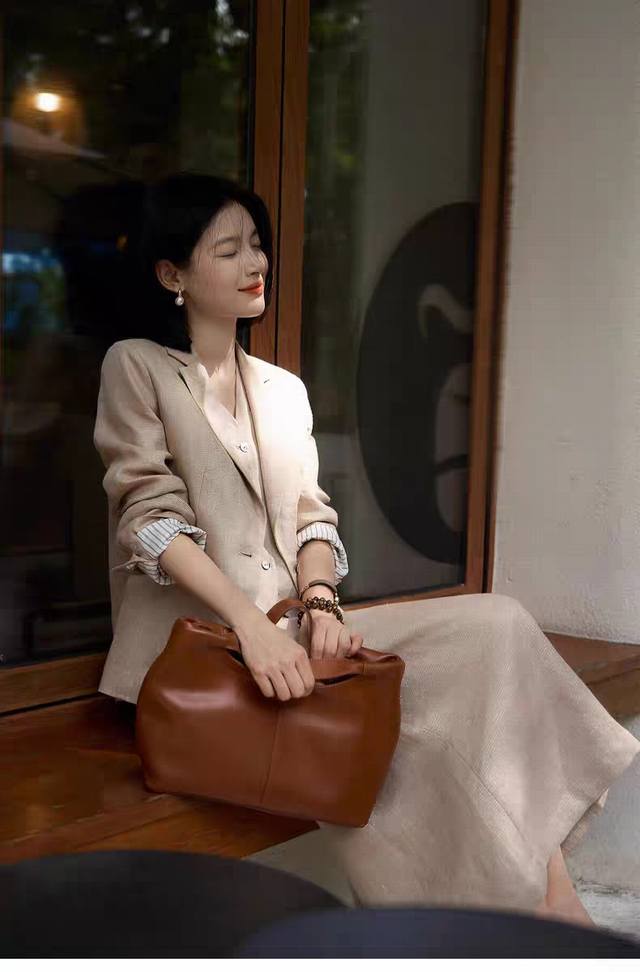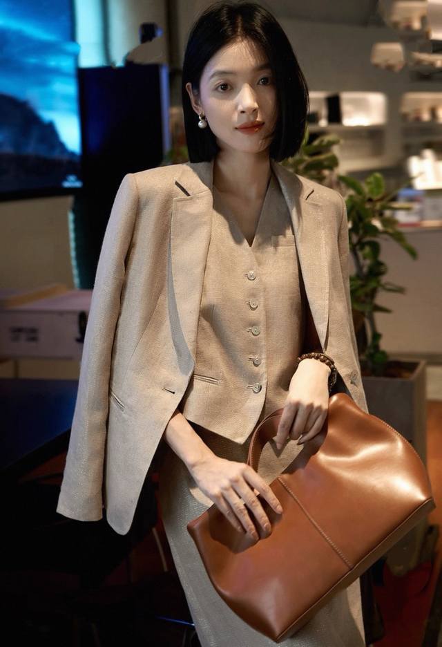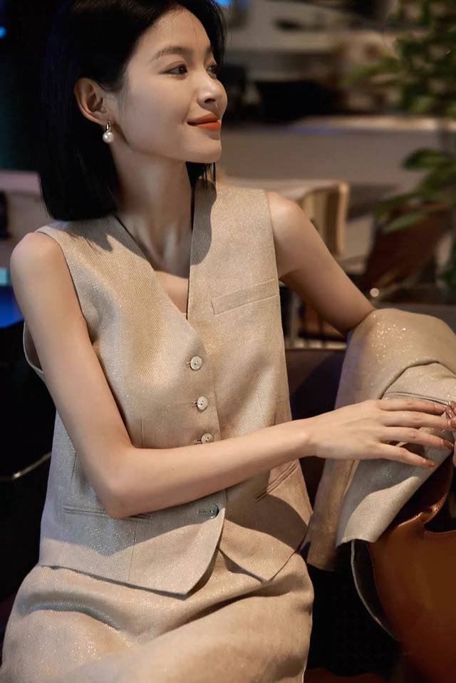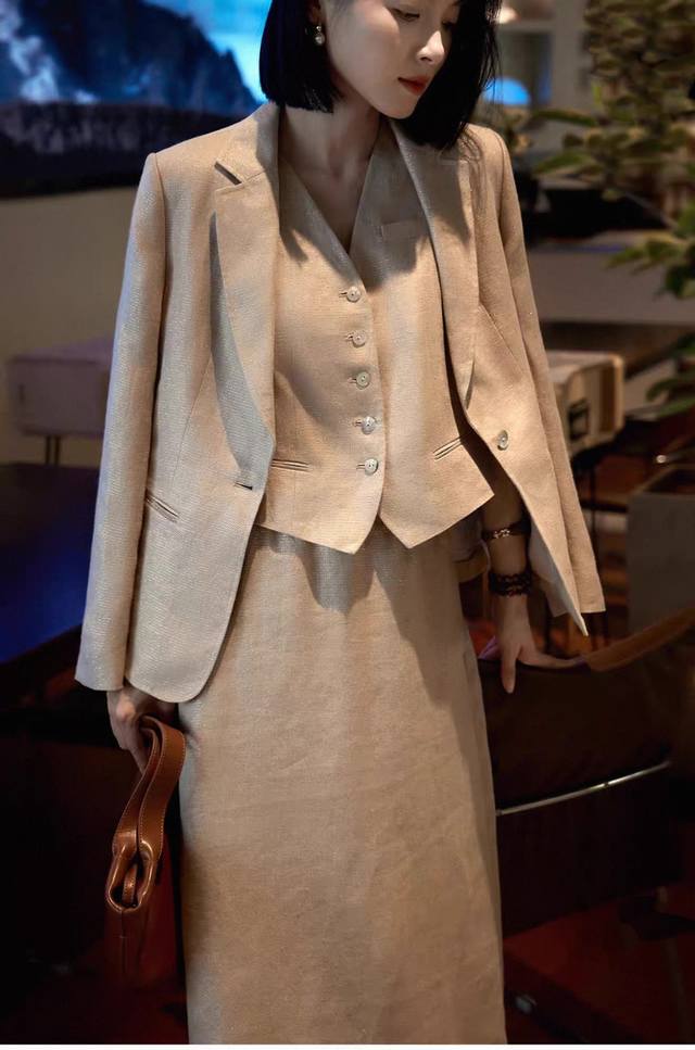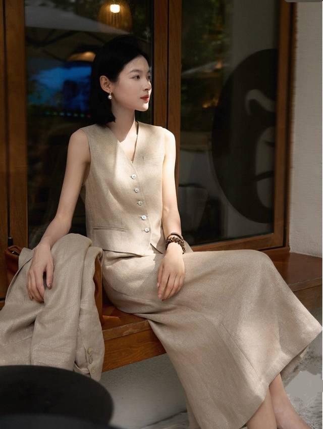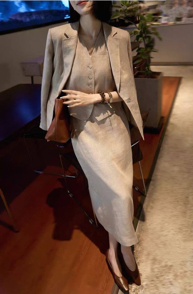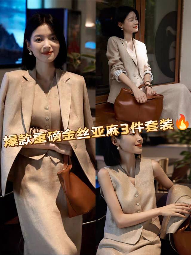 Hot item resale! Heavyweight gold linen 3-piece set! High version! Temperament light luxury high-end loose gold linen big heroine suit jacket + vest + skirt three-piece set, with its own bright silk luster, loose high-end low-key and noble! Smlxl