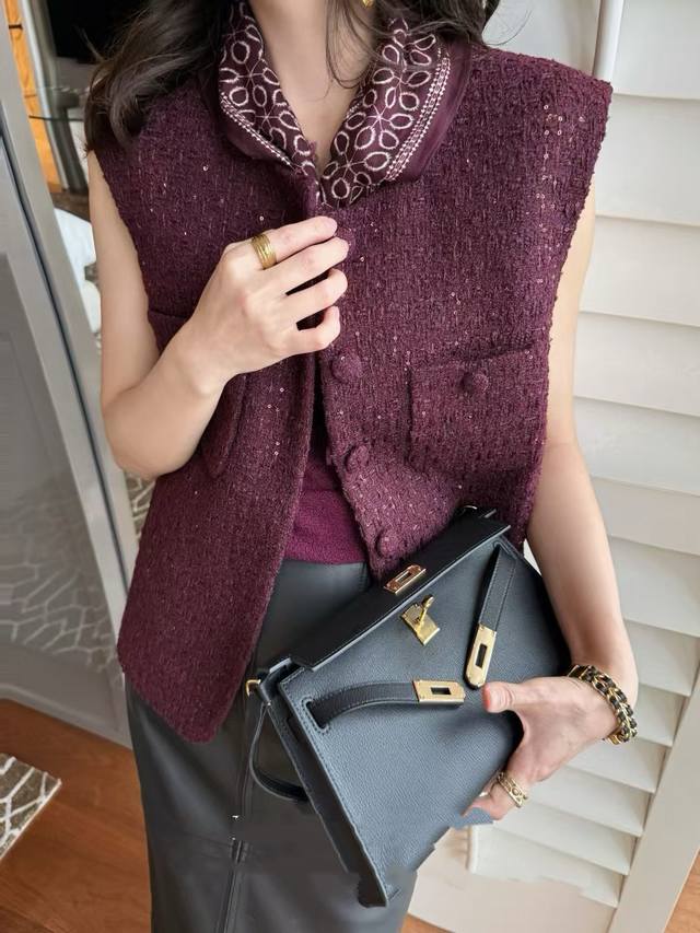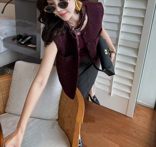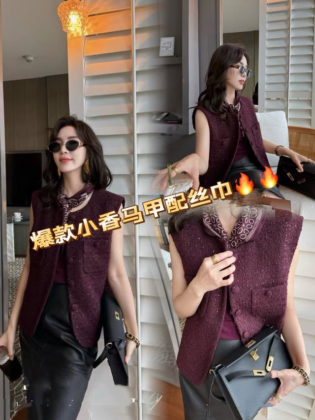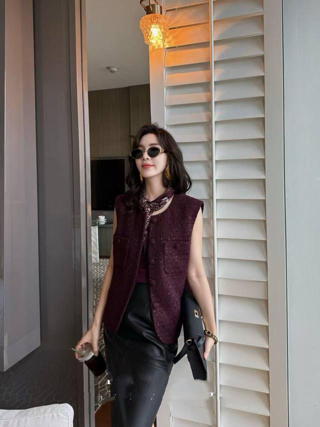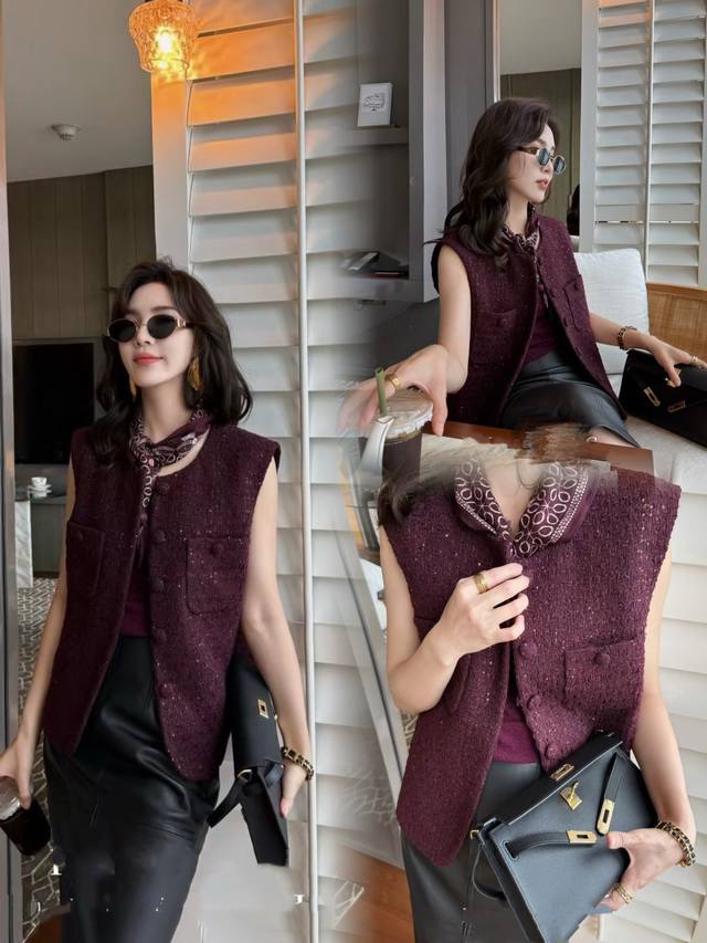 Hot new arrival! 25 autumn tweed braided Chanel vest, plum sauce celebrity temperament niche slimming versatile single -breasted with the same color silk scarf sleeveless vest female Smlxl