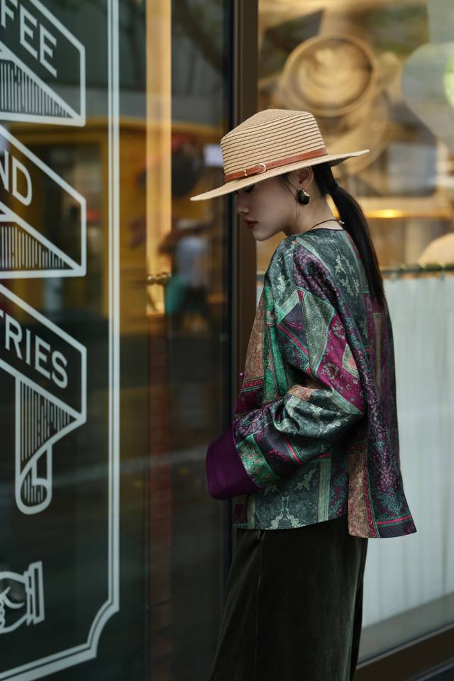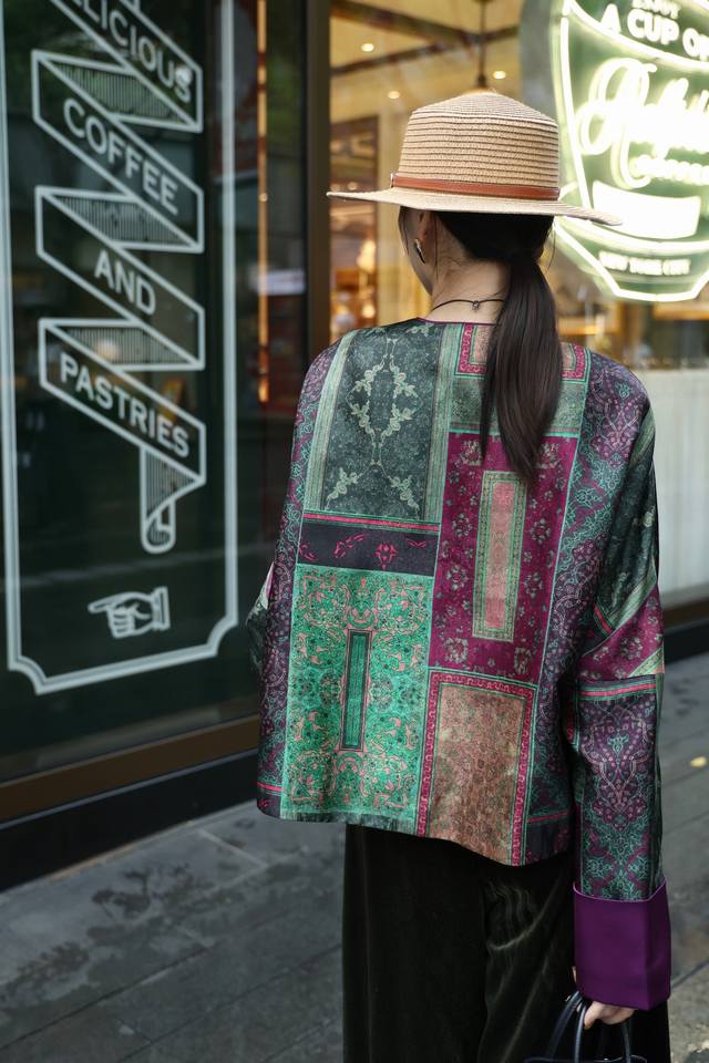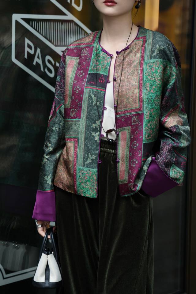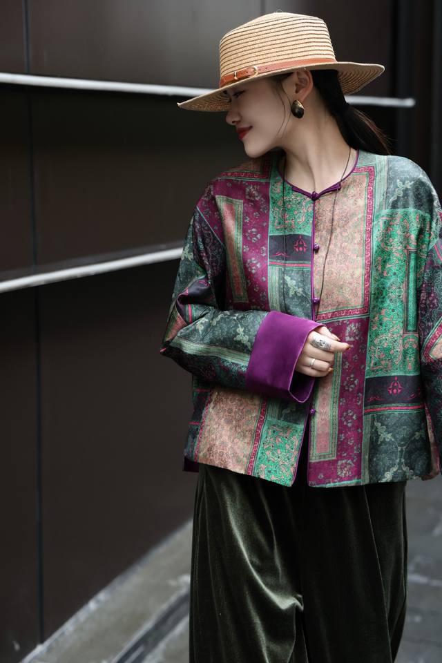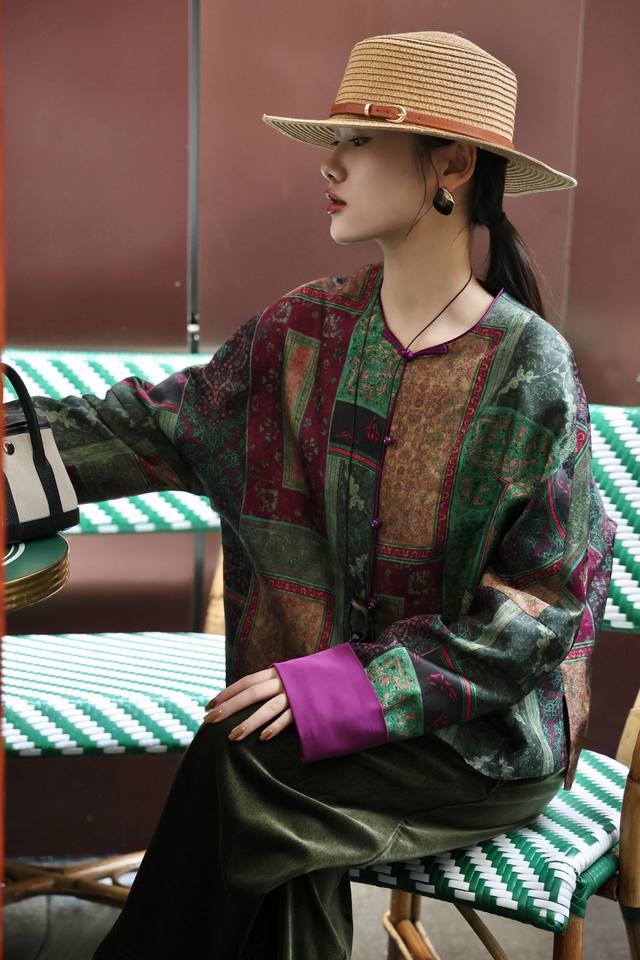 Retro colorblock printed silk Xiangyunsha new Chinese style open cardigan with lining
