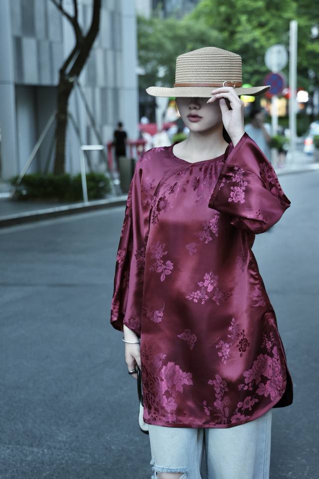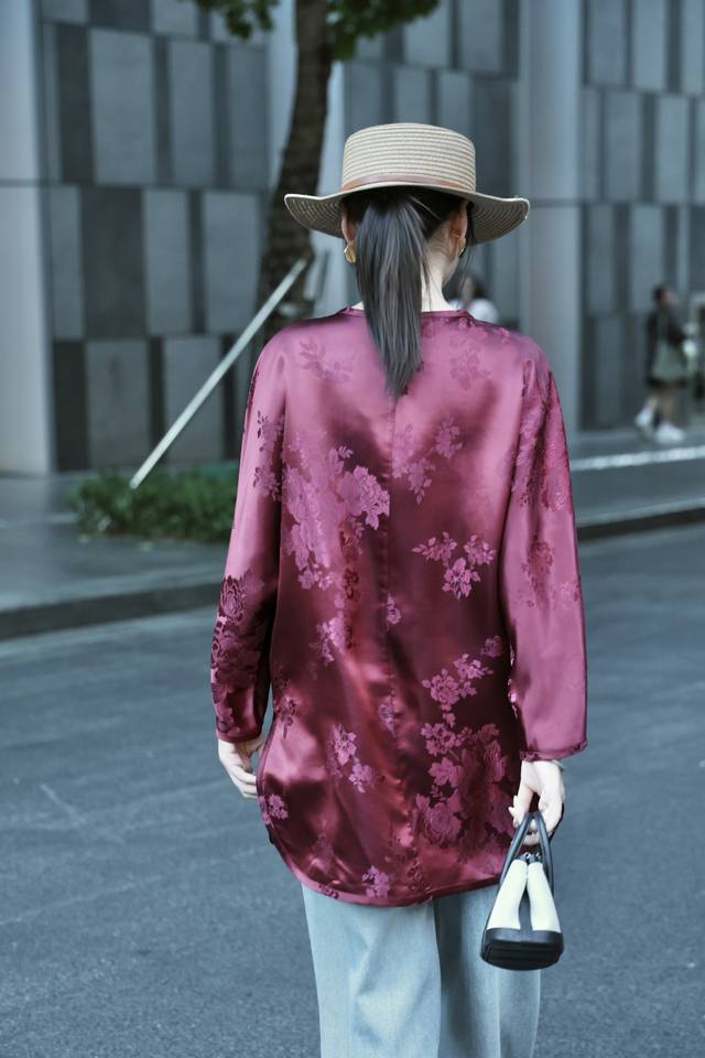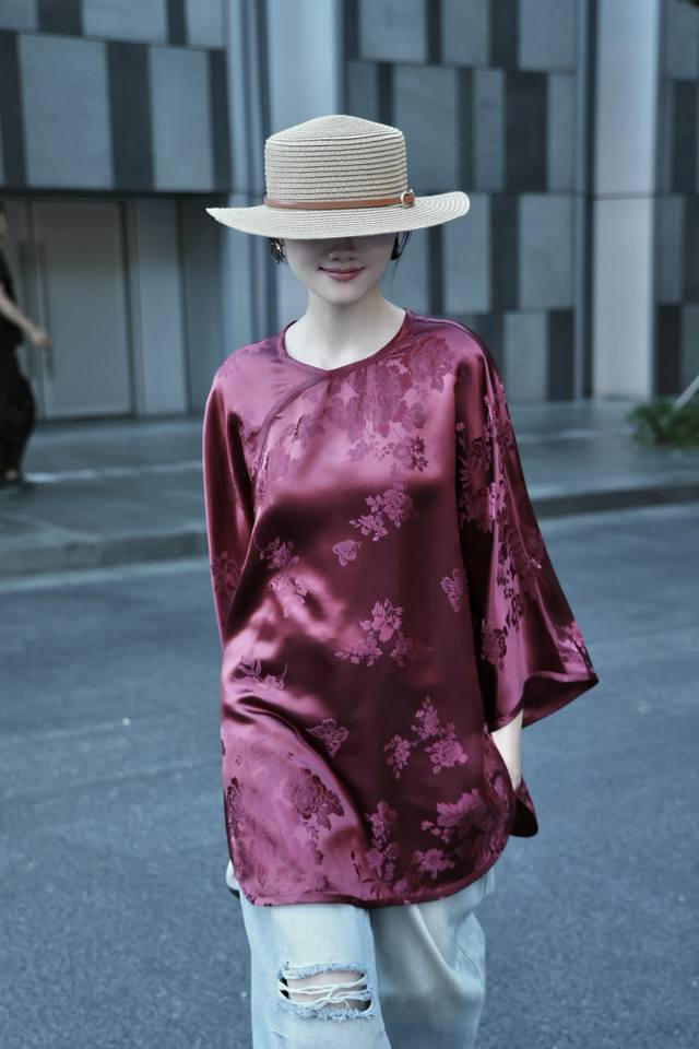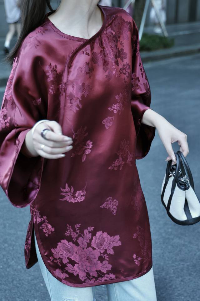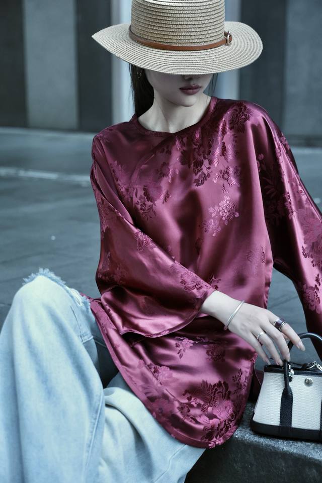 Hot new arrivalRetro wine red old satin casual elegant mid-length topFabric: 30%