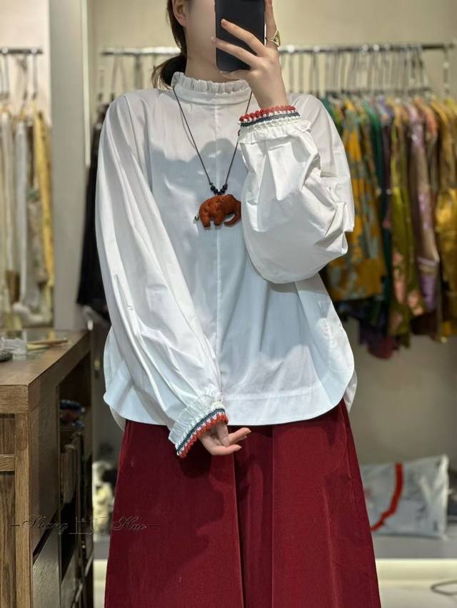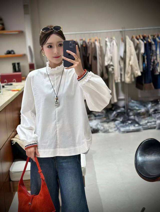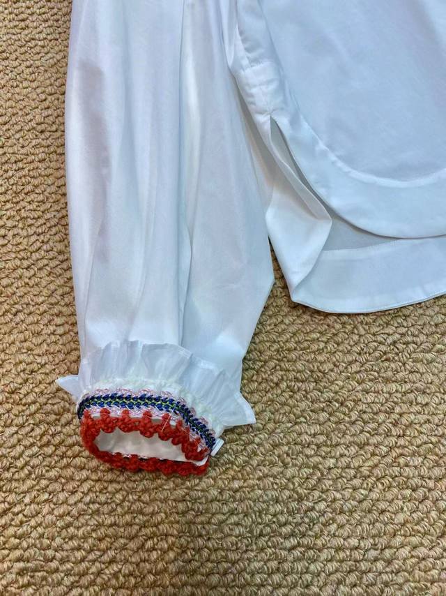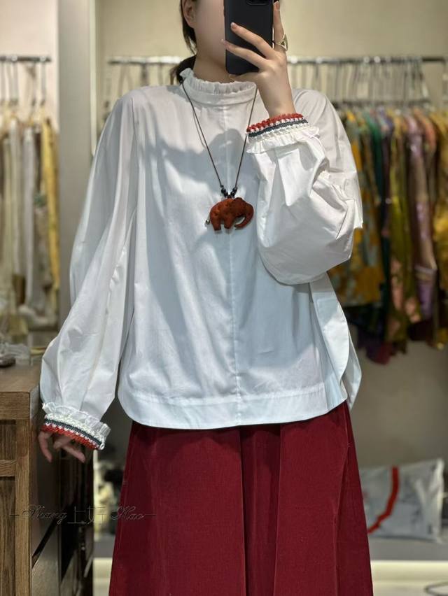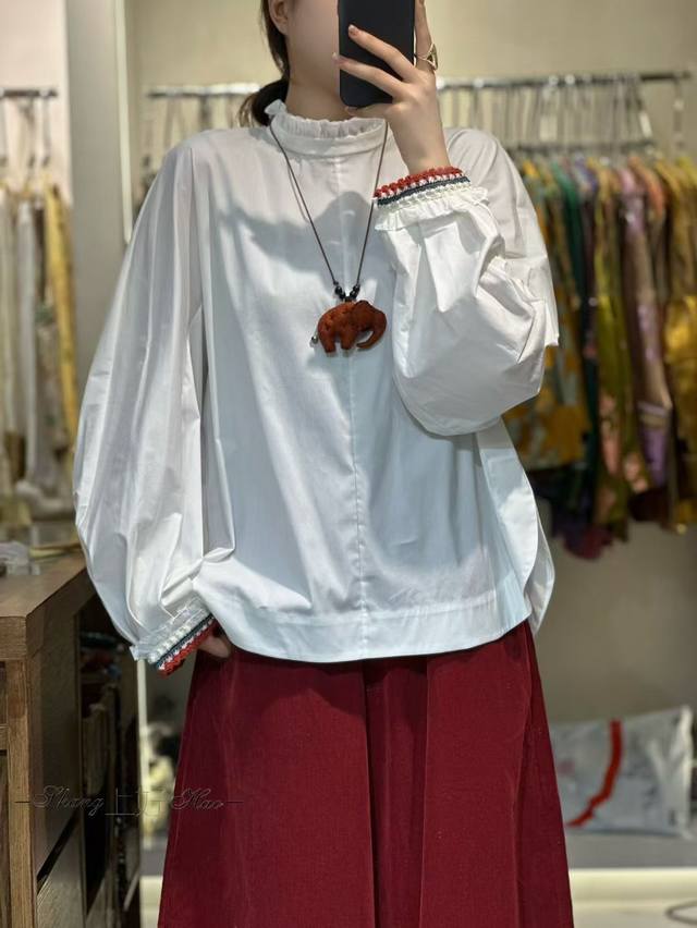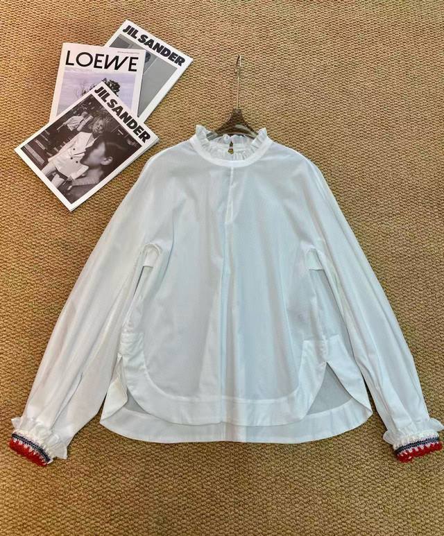 / Hot new arrivalRuffled edge mid-neck loose sleeves crocheted versatile shirtFabr
