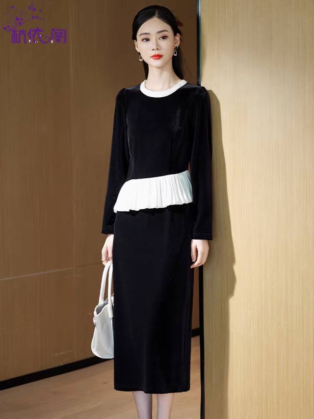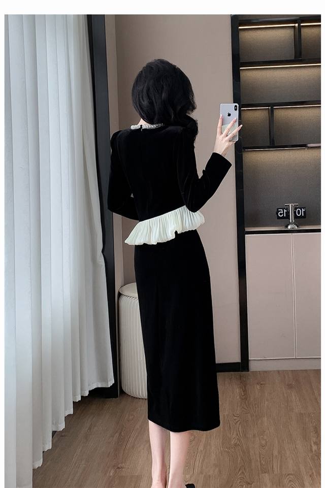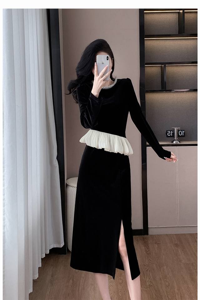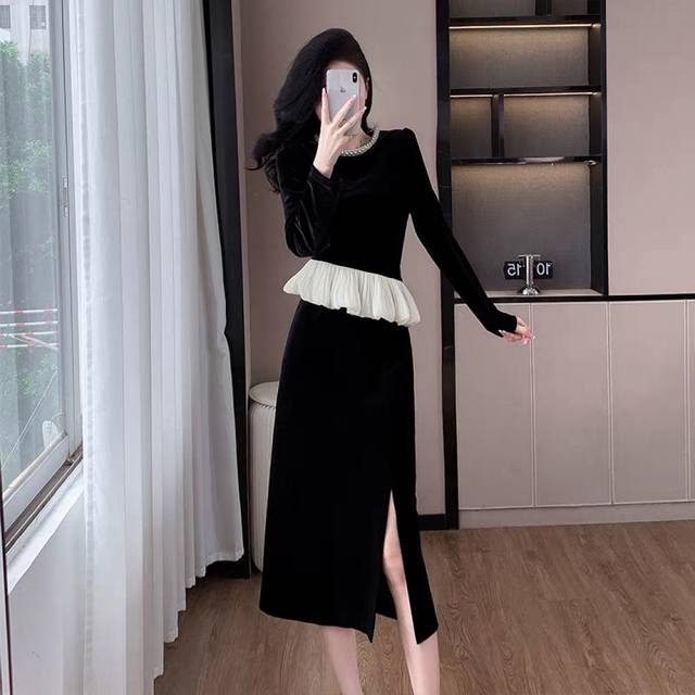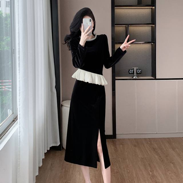 Hot recommendation, fashionable pearl round neck, slim waist, hip-hugging, split gold velvet, new autumn and winter women's suit Smlxl