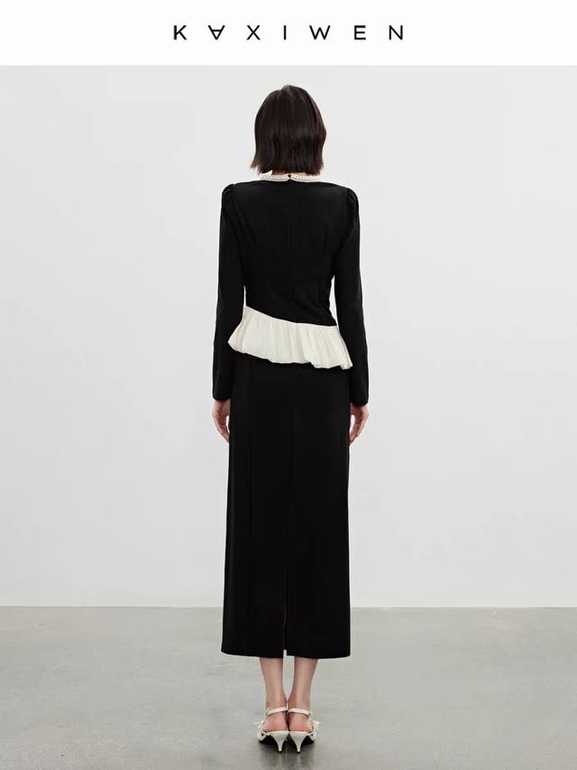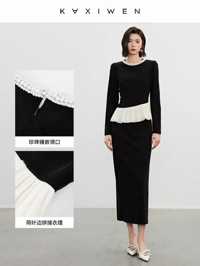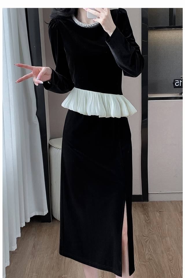 / Hot recommendation, fashionable pearl round neck, slim waist, hip-hugging, spli