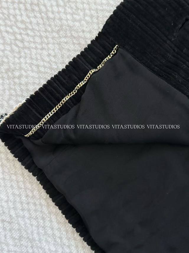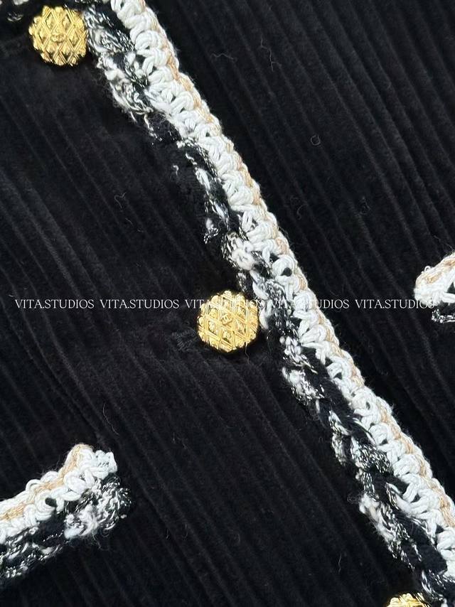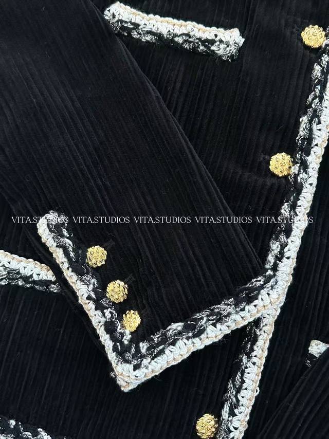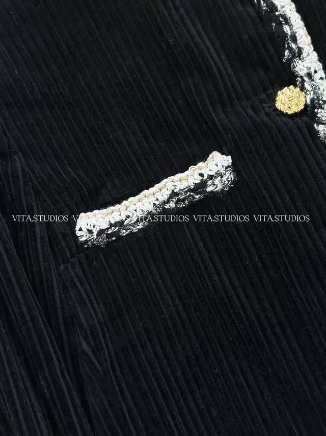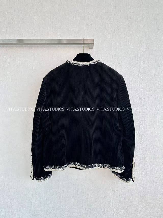 Hot Selling In Stock Corduroy Jacket Made of cotton and mulberry silk. The cotton fabric is comfortable, skin-friendly, and breathable. After washing, the fabric becomes softer and more textured. The lining is made of jacquard double-bridge mulberry silk, which is delicate, smooth, and has a soft luster, enhancing the jacket's luxurious feel and making it smoother and more comfortable to wear. The pockets are hand-stitched with lace after opening, creating neat lines and a three-dimensional effect. All lace and buttons are hand-sewn, adding a touch of sophistication and design to the pockets. The cuffs are gusseted and hand-beaded, increasing the cuff's range of motion and adding a touch of detail. A metal decorative chain is attached to the hem, serving both decorative and structural purposes, making the jacket more three-dimensional. Color: Black Sizes: S, M, L, C, Wt