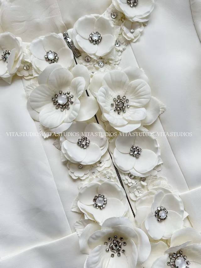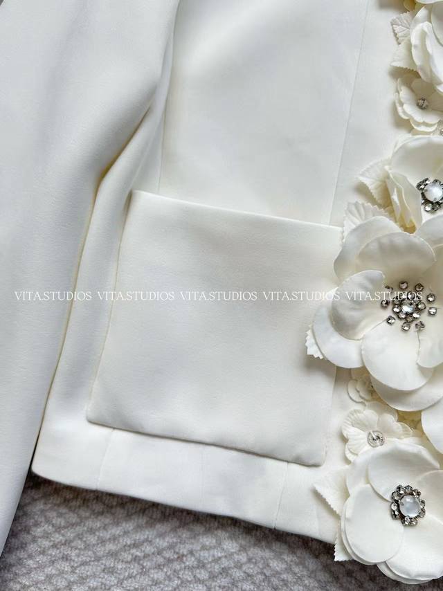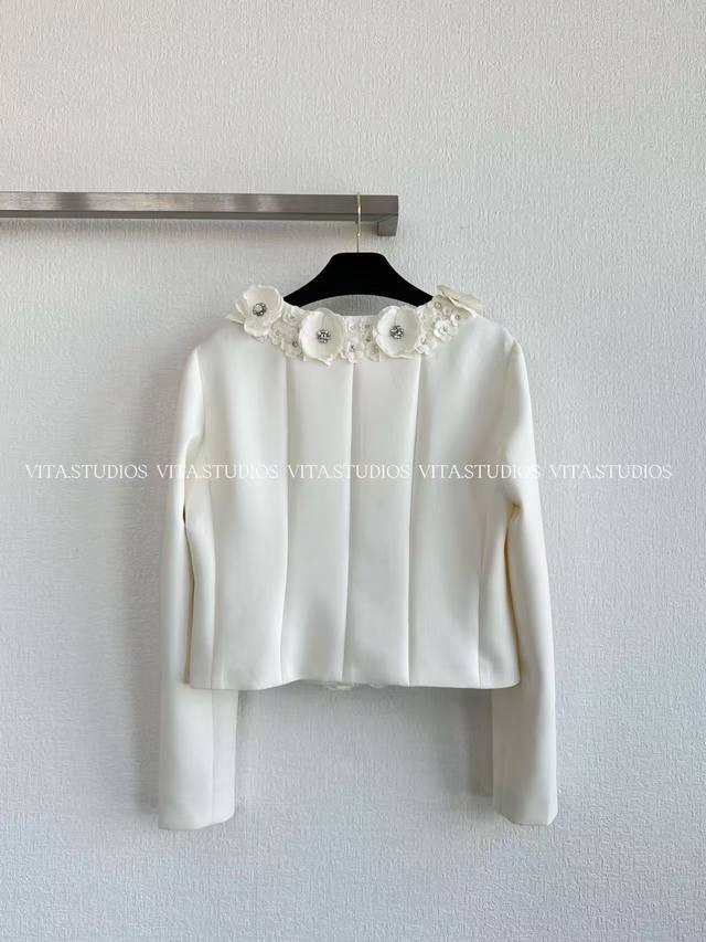 Hot Selling Item, Limited Stock Available. This 3D lace-trimmed jacket features an air-layer fabric with a unique structure, lightweight and elastic, ensuring comfortable wear. The air-layer fabric maintains its shape well, resisting wrinkles and showcasing a refined appearance that highlights the wearer's elegance. The lining is made of 100% jacquard double georgette silk, a smooth, soft, and skin-friendly material. All flowers are custom-made, each meticulously designed and crafted. The delicate petal texture is hand-sewn onto the collar and placket, adding a romantic and feminine touch to the simple white jacket. The short design is classic and stylish, effectively raising the waistline, optimizing body proportions, and highlighting the wearer's graceful figure. Color: White. Sizes: S, M, L, C, Wt.