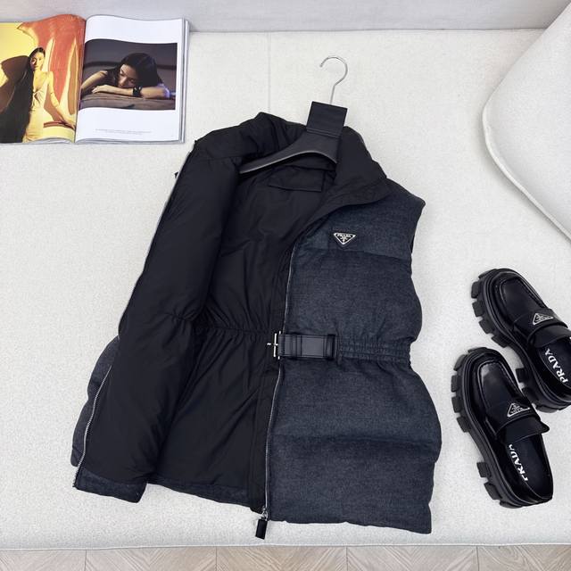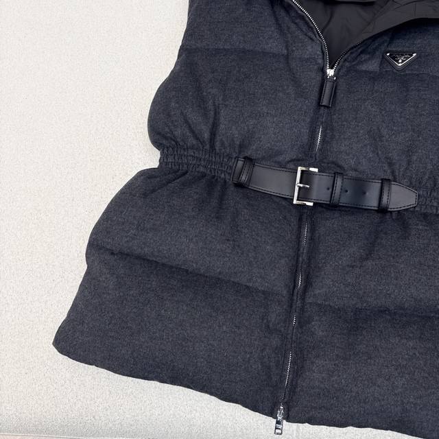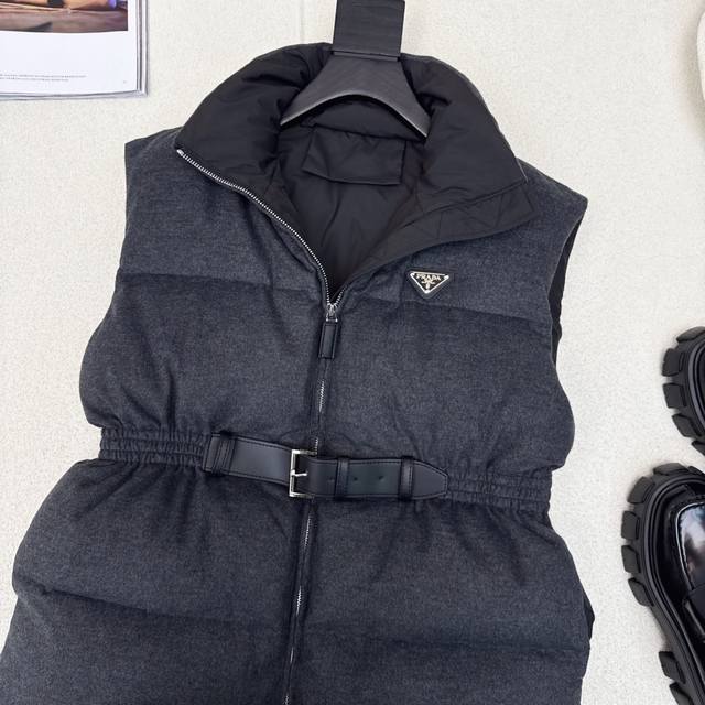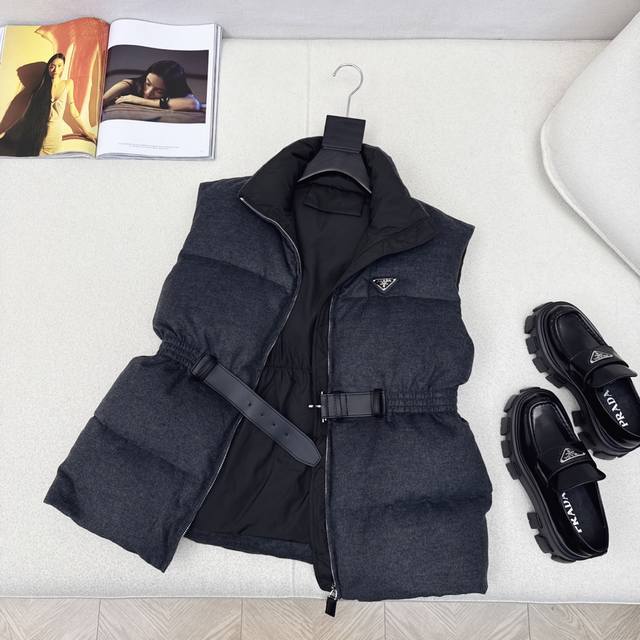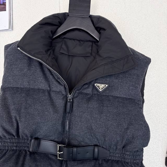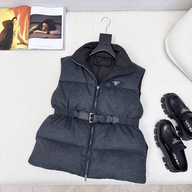 Hot-selling item, pd 25Ss, the latest fall/winter style, with a stand-up collar, belt, and waisted woolen down vest. Suitable for all heights, the mid-length design features a three-dimensional silhouette with buckles and an elastic waist. A stylish and stylish fall/winter must-have streetwear layering piece for warmth. Classic logo and triangle embellishment. National standard 90% down filling in three colors. Available now. Size Sml S, chest 106cm, length 63cm.