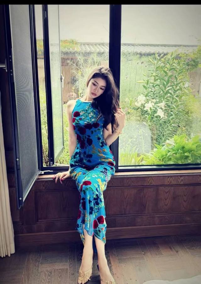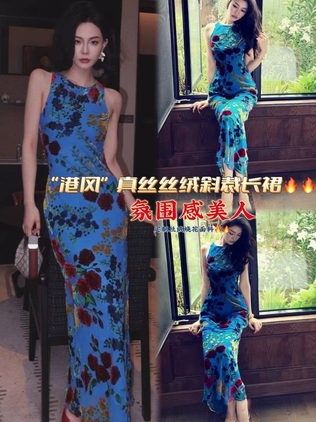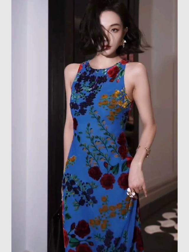 Hot-selling velvet burnished bias-cut maxi dress. "Atmosphere Beauty" Hot-selling silk velvet blue floral dress, strikes the perfect balance between retro and sexy. Made of premium satin, it drapes smoothly, outlining the graceful curves. The sleeveless design highlights the shoulders and neck. The retro print is like wearing an oil painting on your body. It exudes an elegant aura while walking, and can easily slay the whole audience. Smlxl