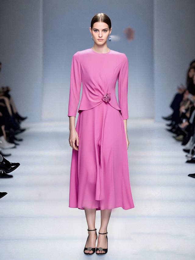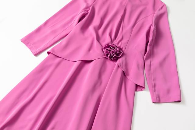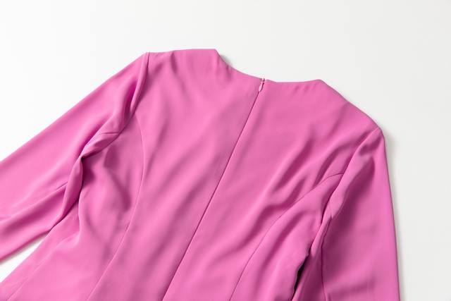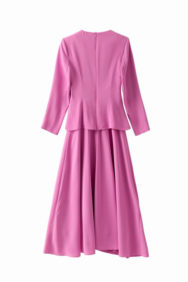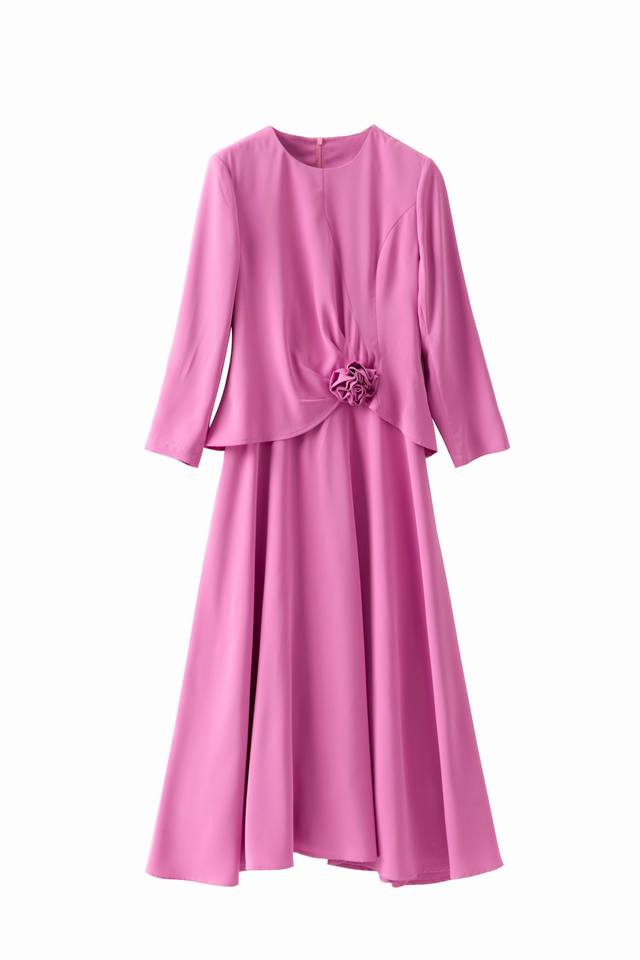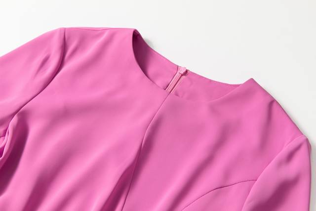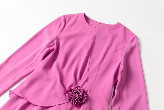 Hot-selling women's clothing early autumn new fashion round neck back center zipper purple side waist custom handmade flower fake two-piece wide hem medium length nine-point sleeve slim waist dress shows intellectual beauty, urban women's dressing benchmark shows temperament original quality