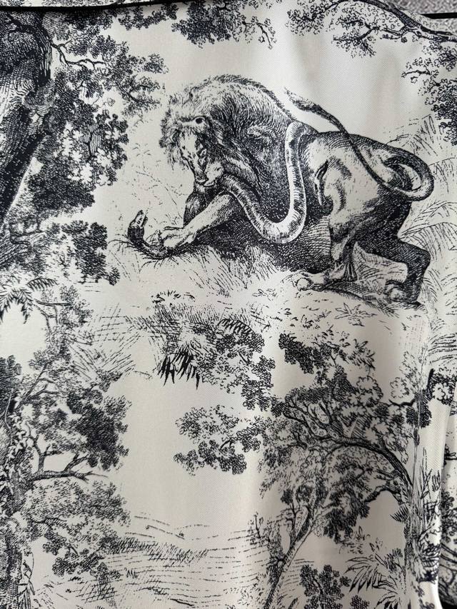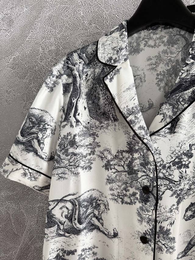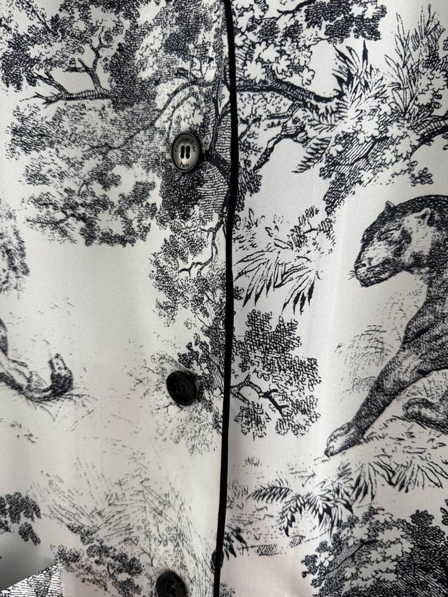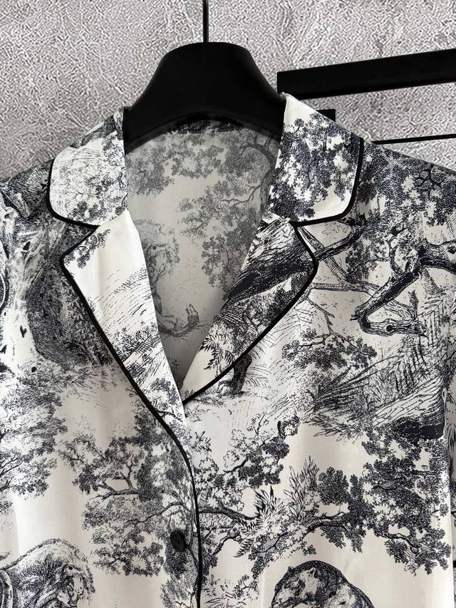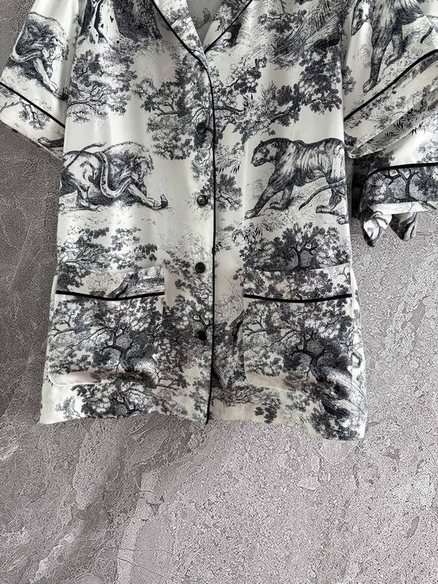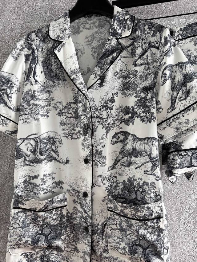 , style 52P. Classic loungewear set | Sold as one set, uncut. From the Ruyi Home collection, this set features a reverse print, reinterpreting the classic forest animal logo. An eco-friendly watermark highlights the inverted color. Crafted from 100% mulberry silk twill, this set features all-over prints and tailoring. Be mindful of the different versions. This refined, high-end quality creates an inexplicable sense of peace, instantly relaxing both the body and mind. Its practicality is undeniable, making it suitable for outdoor wear, a celebration of the joys of home life.