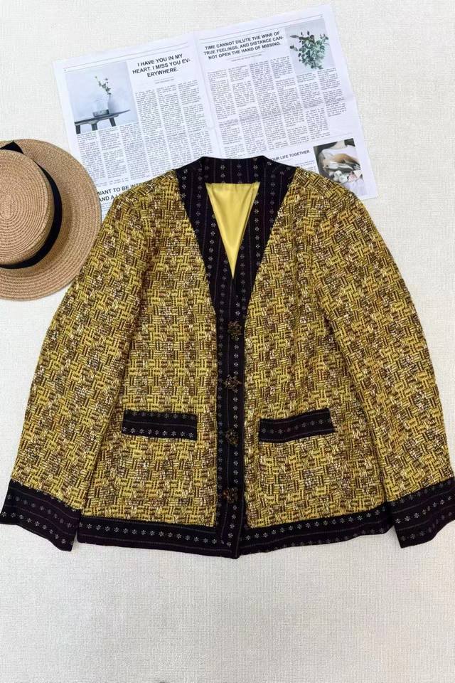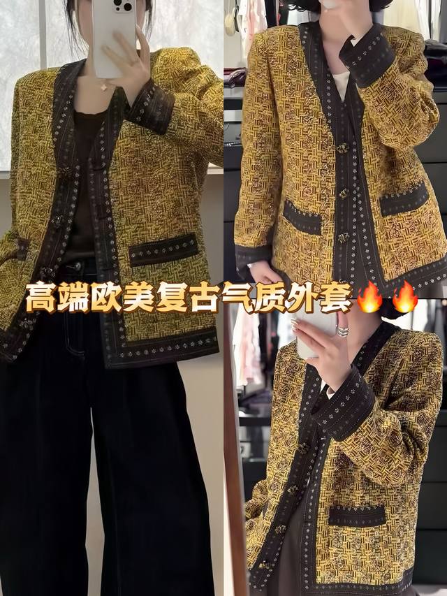 Invincible hot-selling high-end European and American retro high-end temperament jacket Classic V-neck design Exquisite buttons are arranged in an orderly manner The edges are decorated with delicate patterns The overall tailoring is neat and the details are exquisite Smlxl