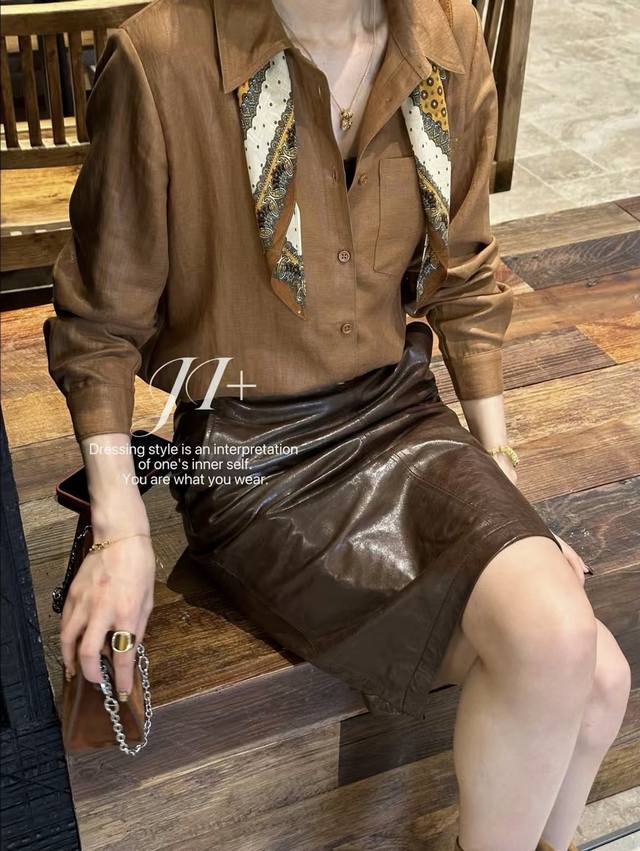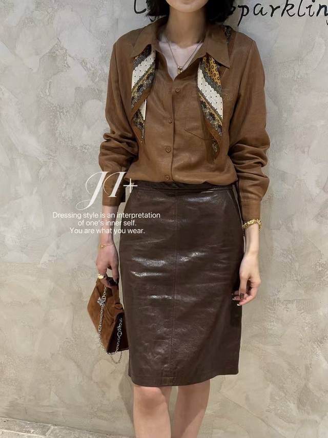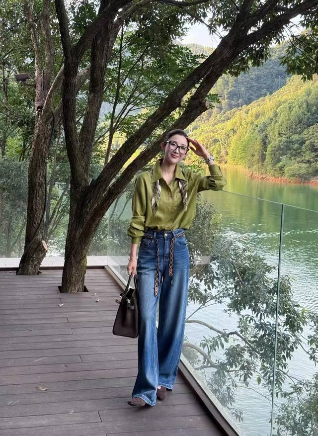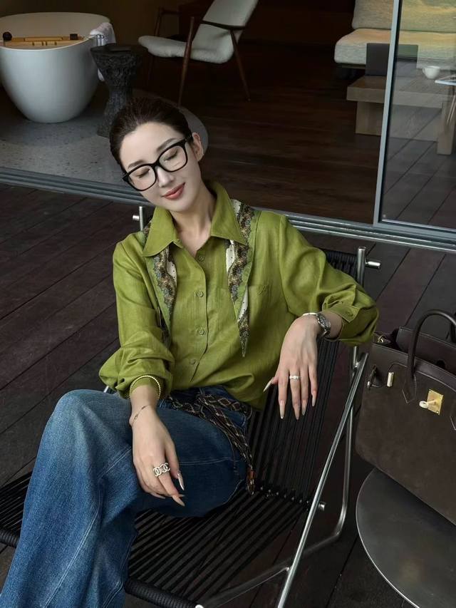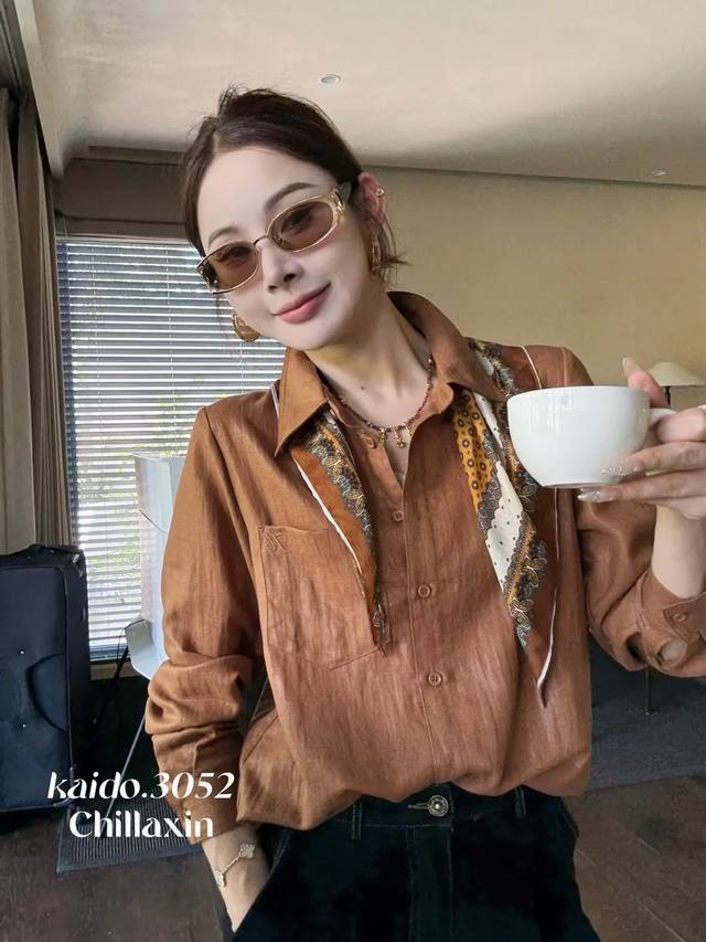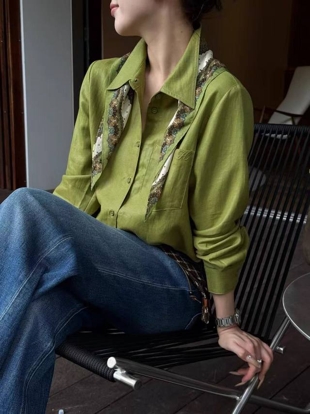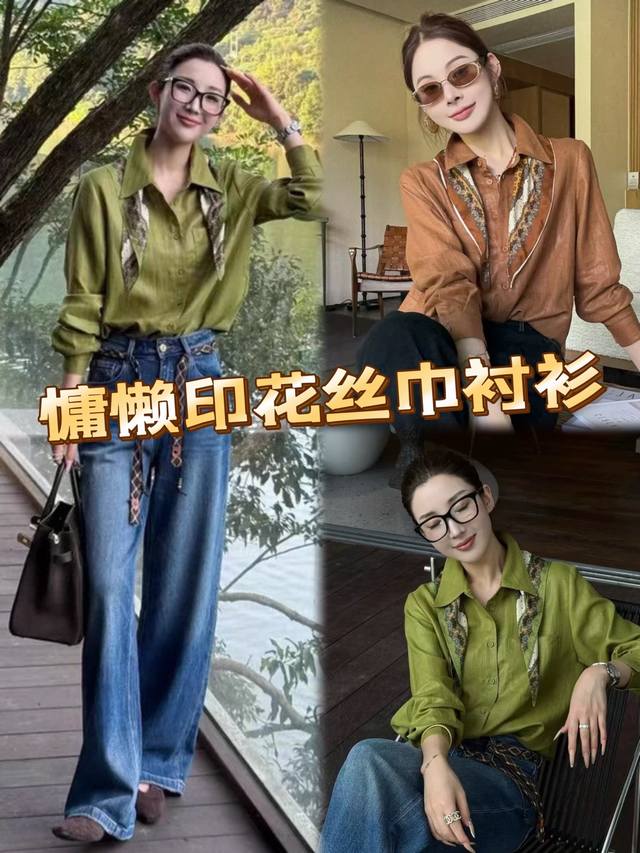 It is so stylish. The simple and casual shirt is paired with a printed silk scarf. It is simply an atmosphere of beauty and has its own painting effect. Advanced, elegant and quiet colors attract the eye. Smlxl