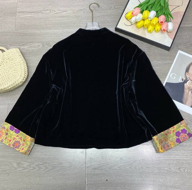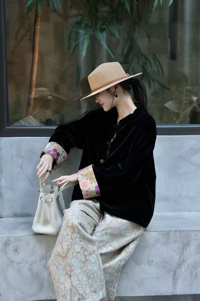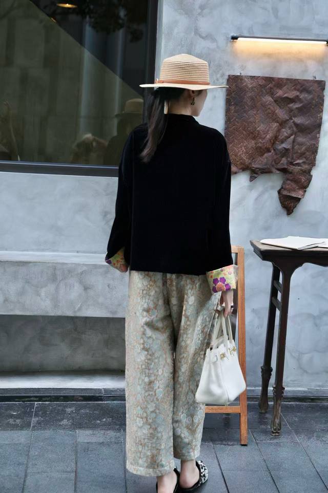 early autumn popular silk velvet round neck patchwork rayon streamer brocade pure handmade flowers slimming loose simple long-sleeved jacket top