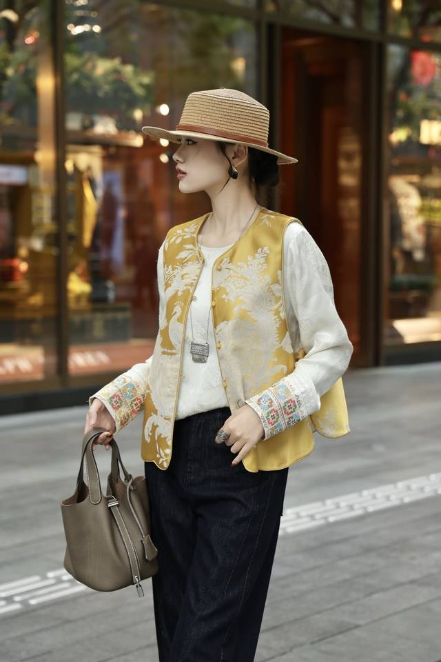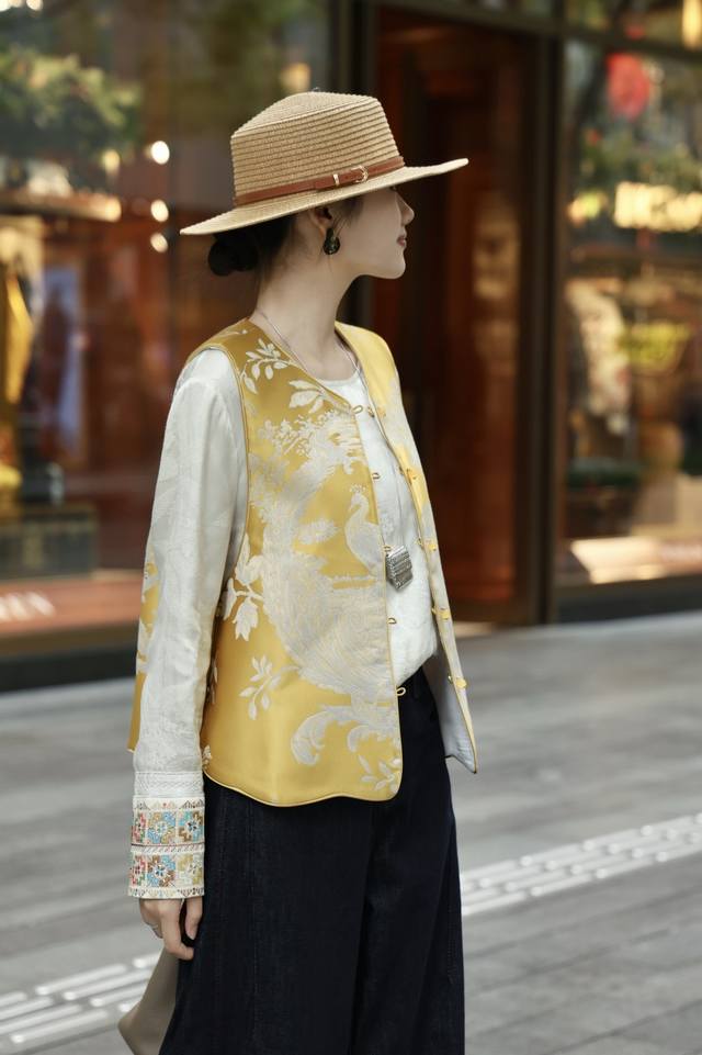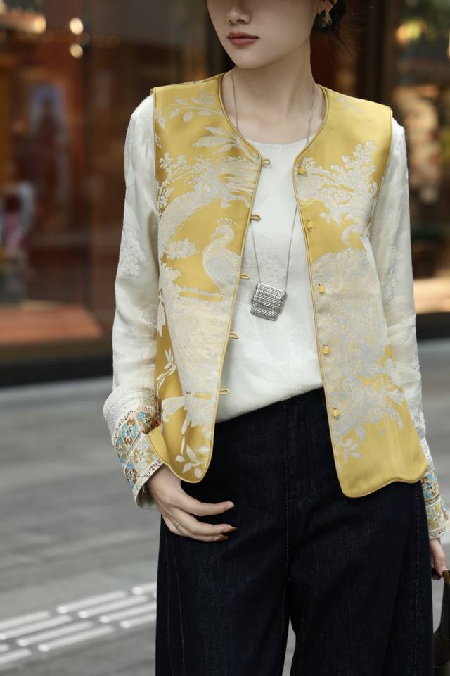Golden Phoenix Jacquard Reversible Vest. The gold-woven technique outlines a phoenix's rebirth, bringing auspiciousness to the wearer. The intricate jacquard pattern shimmers.