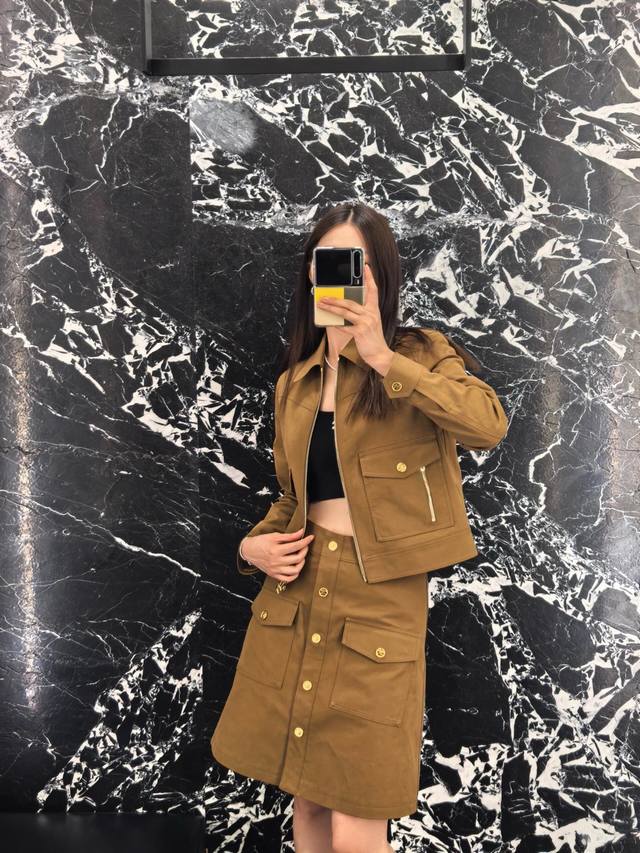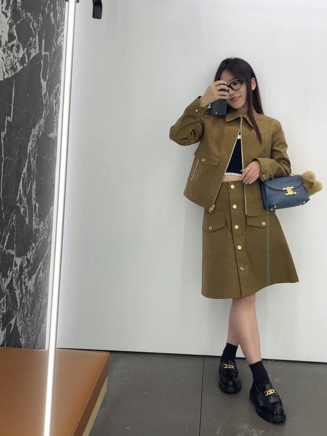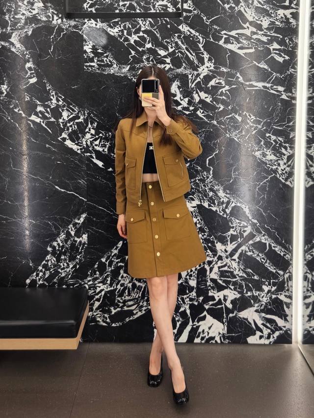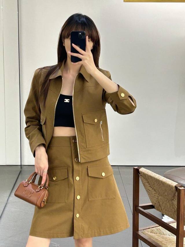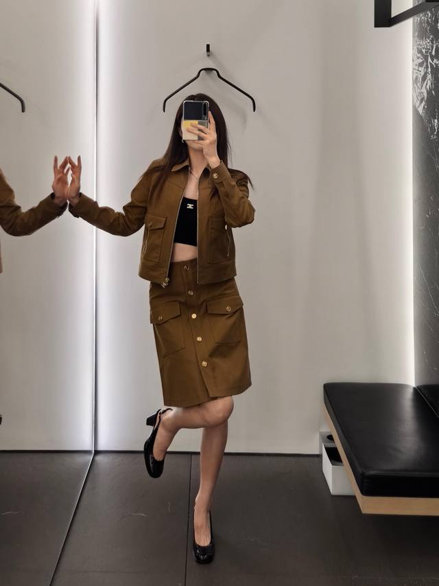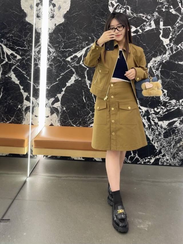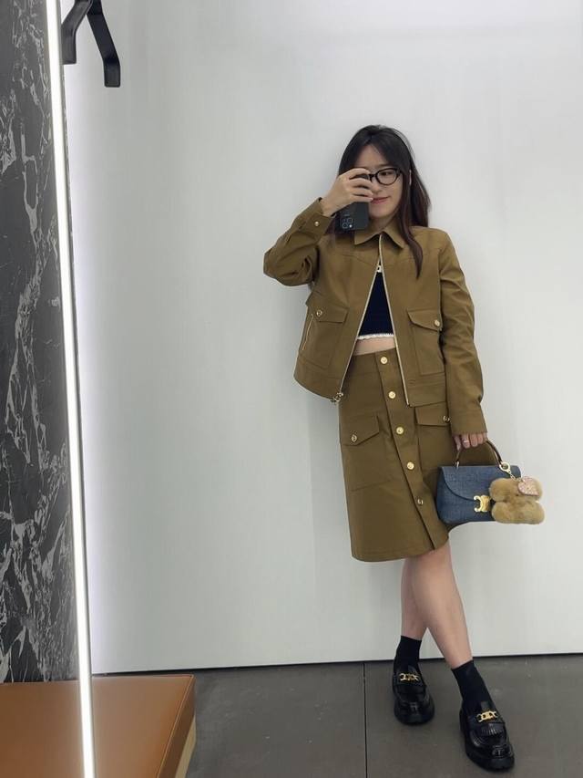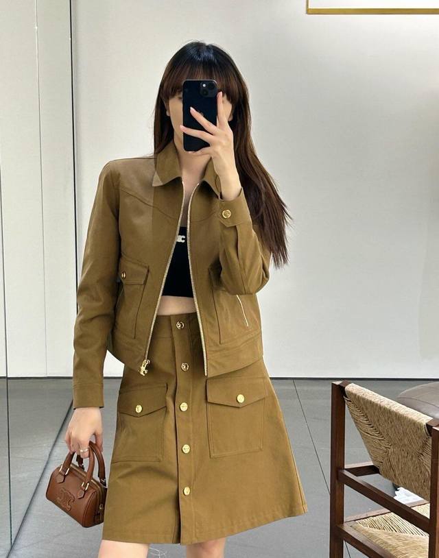 Skirt Celin* 25Fw Early Autumn New Arc de Triomphe Workwear Style Jacket + Skirt Set | Exclusive Yb development! High-end production! Cool and handsome khaki small jacket, super slim, captures the wardrobe inspiration from bright summer to elegant early autumn, loose silhouette with rich colors to create a neat Western short jacket set, high-end color, crisp cotton, very textured, available now SML