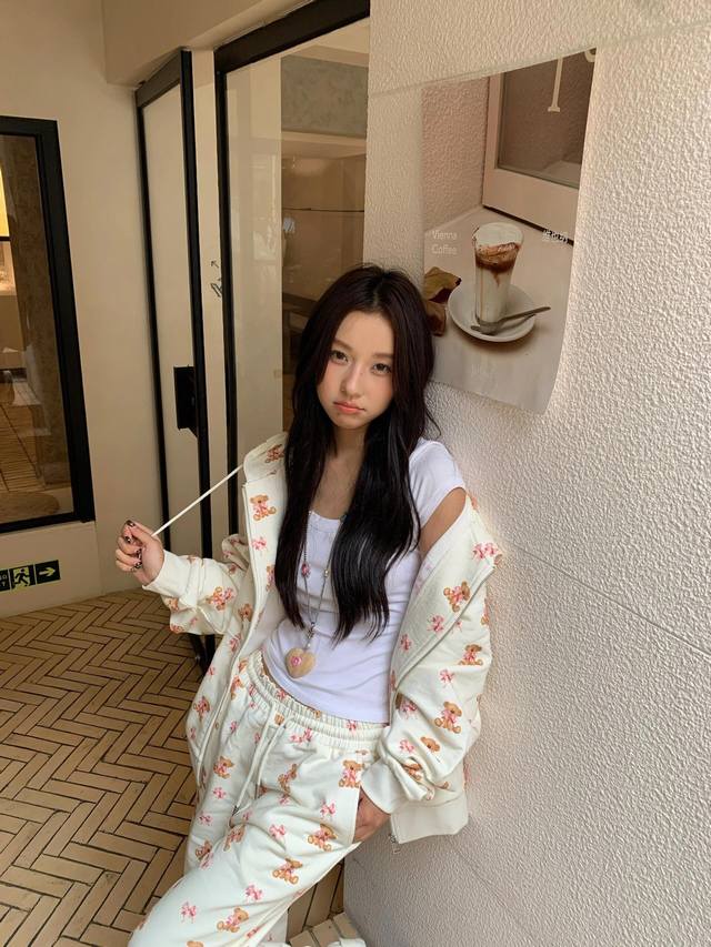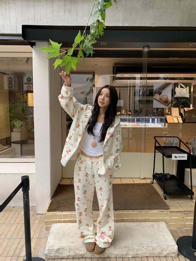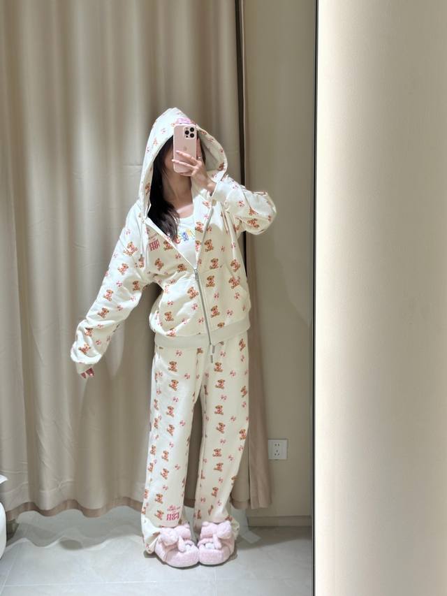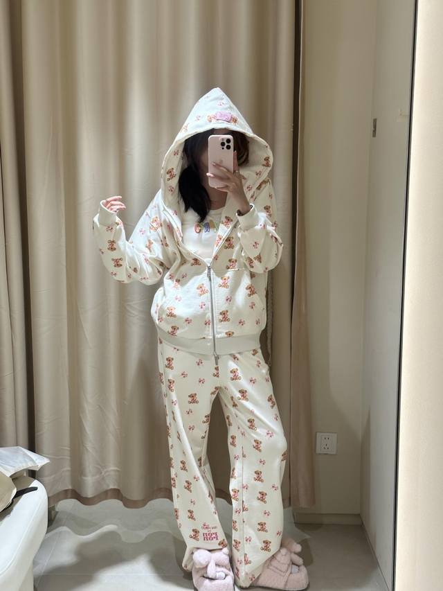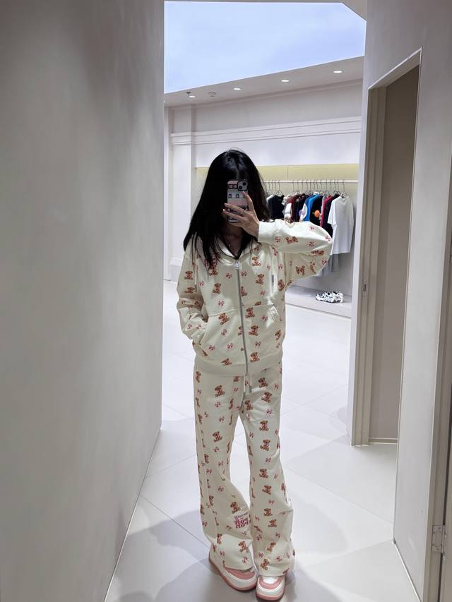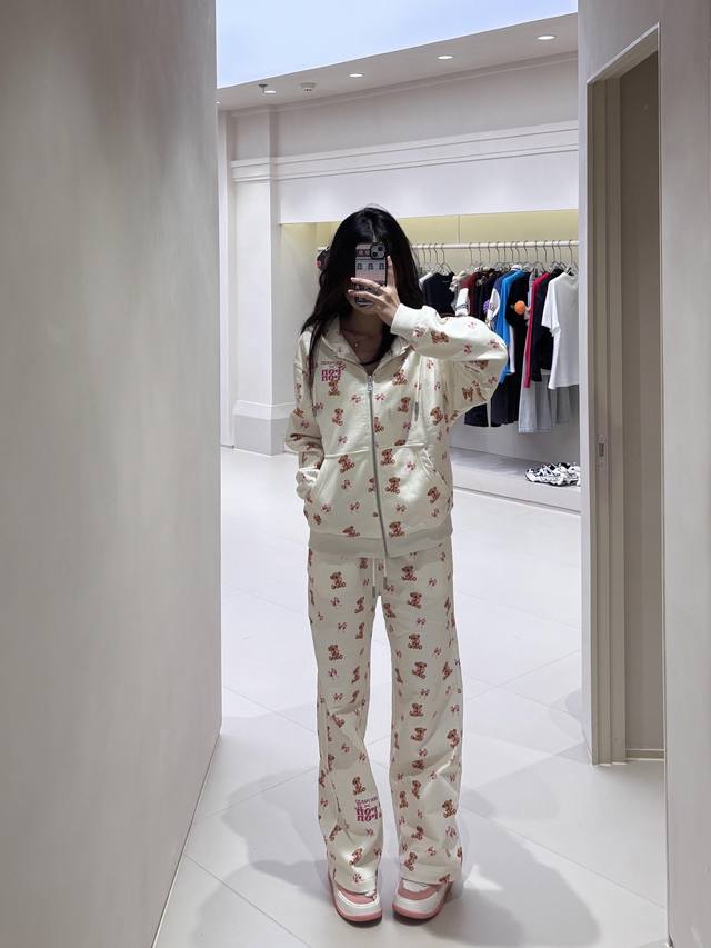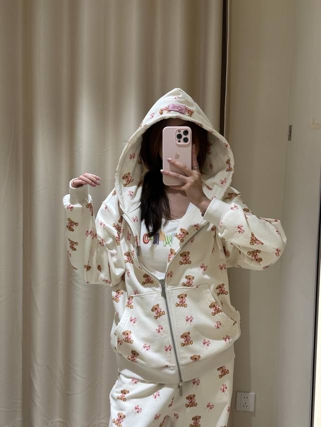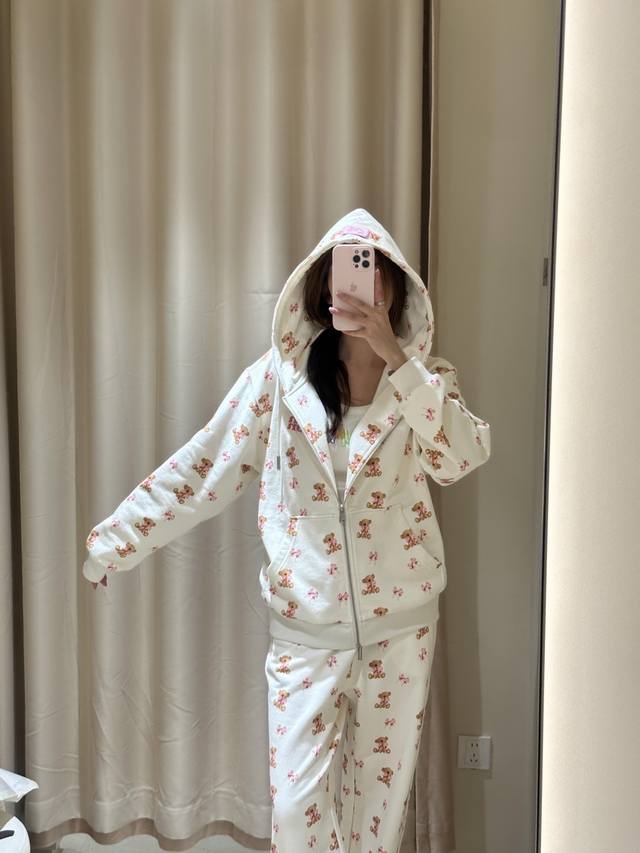 Sweatpants 13De X Ronr*N Collaboration 25Fw New Fall Casual Hooded Sweatshirt Jacket and Sweatpants Set | Exclusive High-Edition Production! The all-over bear print has a healing buff, and each bear is tied with a pink bow, sweetly "sticking" against the off-white and light gray background. It's cute but not childish. The hooded zip-up sweatshirt and wide-leg sweatpants combination is the standard for lazy and casual wear; the loose fit is friendly to all body types, and wearing it is like wearing a cloud. The branding details are subtle and thoughtful, and the trendy attributes are directly enhanced. In stock S M L