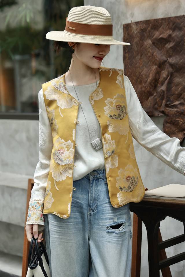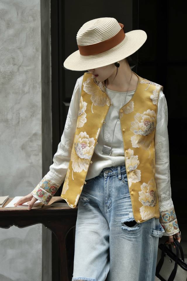 This reversible vest features a layered peony jacquard weave, recreating the floral splendor of the Tang Dynasty. The peonies bloom amidst the flowing waves of the fabric, a modern interpretation of the flowing, fragrant waves and floral shadows, creating a poetic effect. As the hem flutters, it transforms into a mobile oriental garden. Smlxl