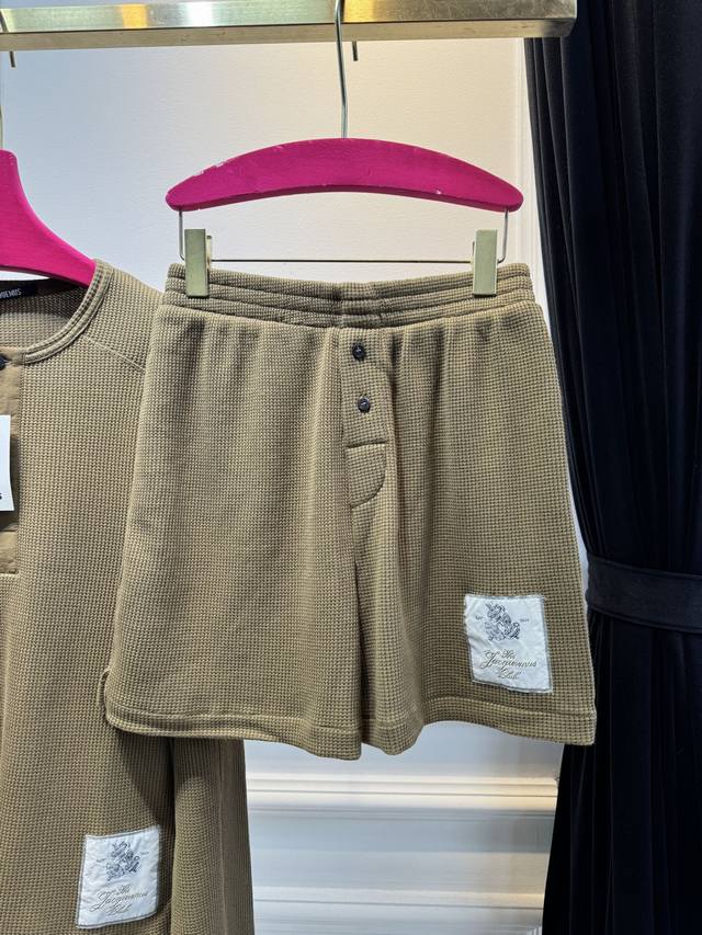 In terms of style design, the top is a Henry collar style with several buttons at the neckline, which adds a sense of design and detail, breaking the monotony of solid colors; the overall version is relatively loose, creating a casual and relaxed style. The shorts are also loose-fitting, which is convenient for daily activities, and there are decorative elements such as patches on the trousers, which add highlights to the simple style. The whole outfit is casual yet fashionable, suitable for creating a relaxed and comfortable daily look.