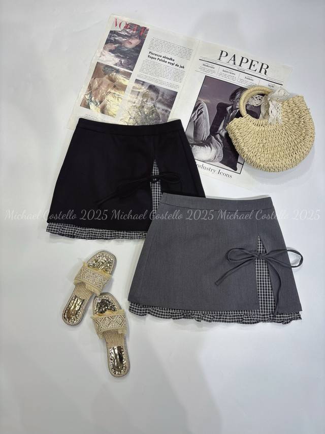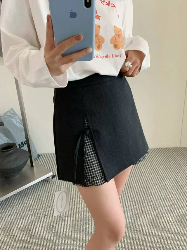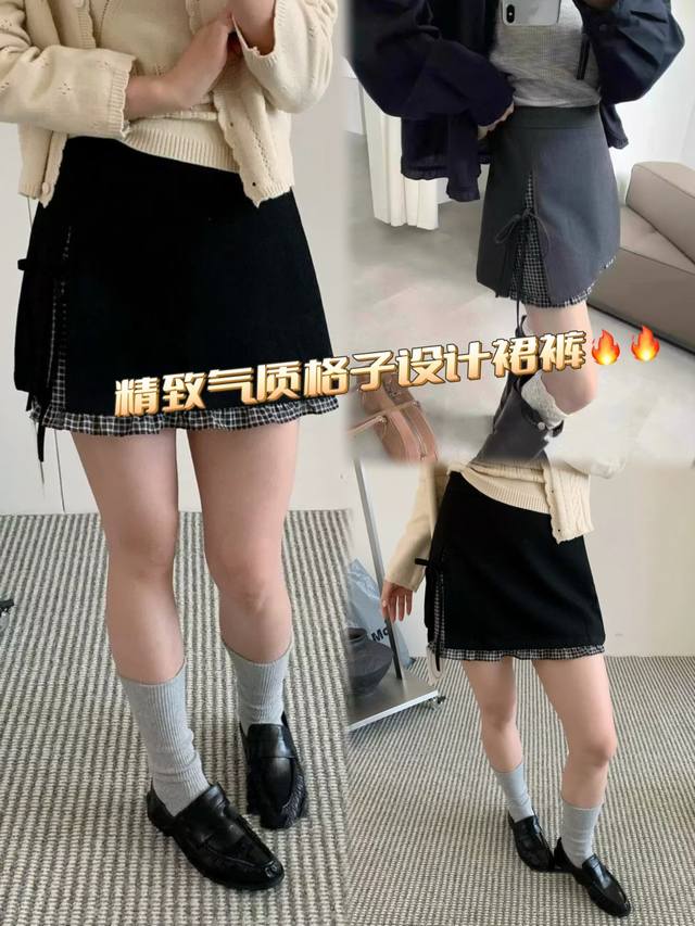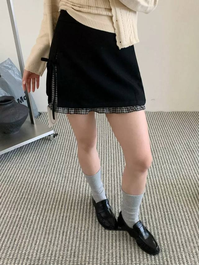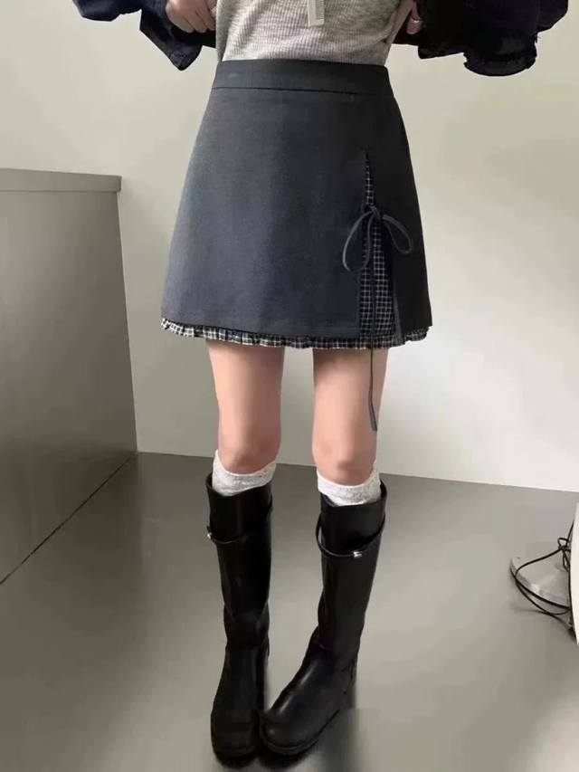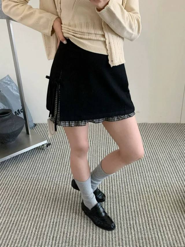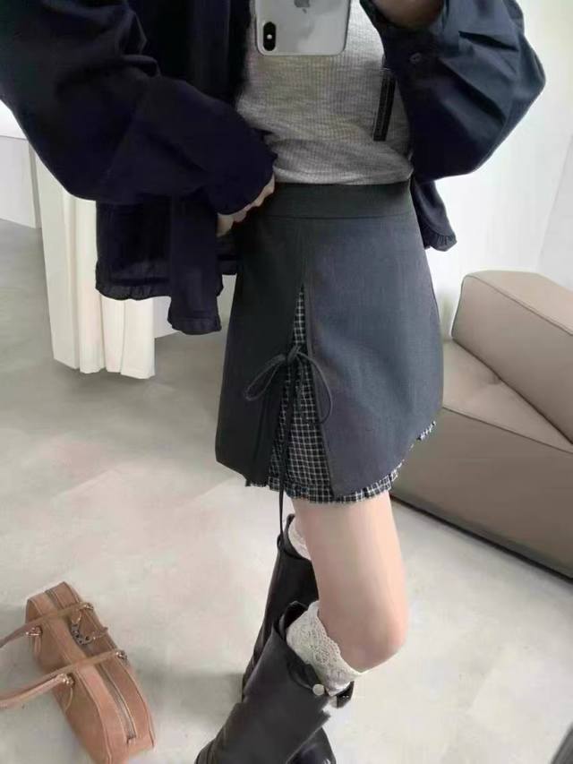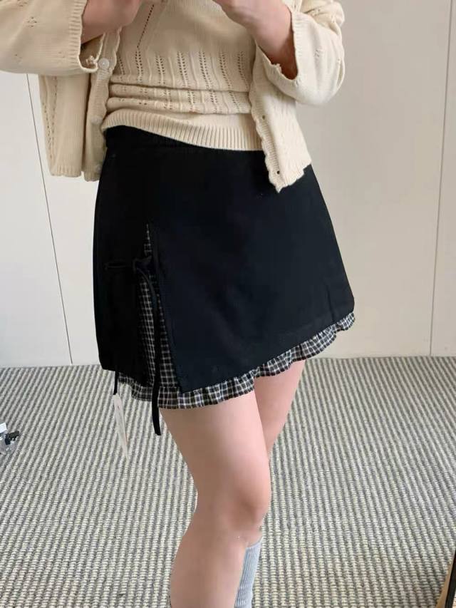 Korean side strap design niche A-line skirt design full of short skirt fake two-piece splicing plaid inner wear looming side straps add a smart version of the giant leg length two colors Smlxl