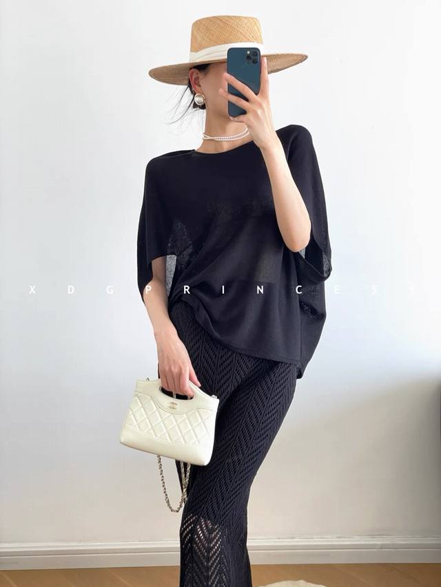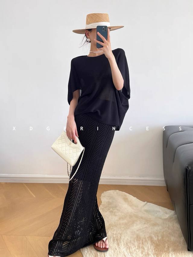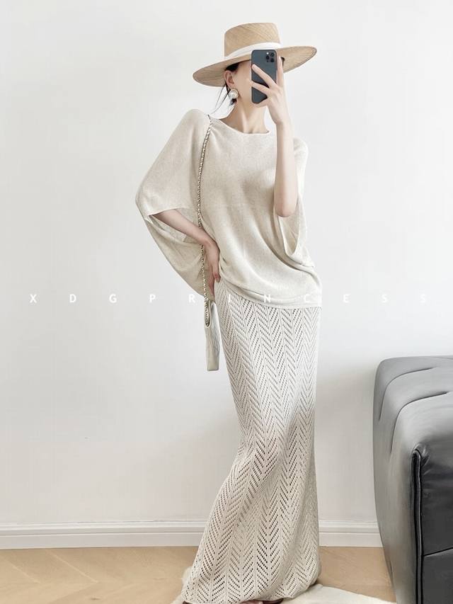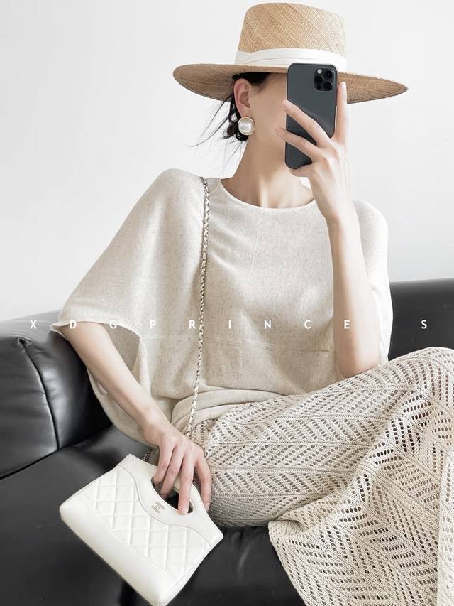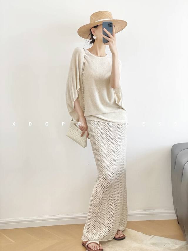 Lazy and casual! Fashionable and high-end vacation wear linen short-sleeved cape loose bat sleeve pullover sweater skirt suit sequin fine wool