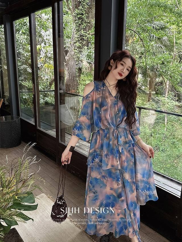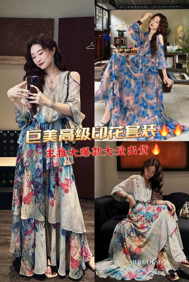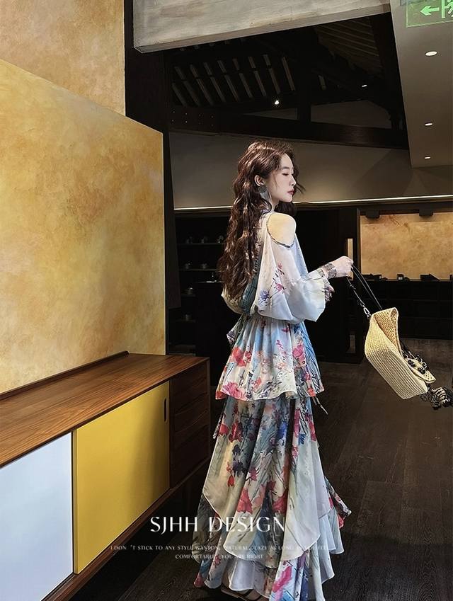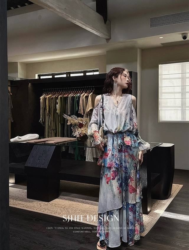 Light luxury high-end version of floral style, beautiful high-end ethnic style printed shirt + dress two-piece set, double-sided high-penetration printing, both front and back are picturesque, with cloud-like lightness, layered with a small shirt for a more layered look, the off-shoulder design adds a sense of lightness, shaping a smart posture, and the precise pleating system creates a dynamic balance between the silhouette and the body curve. The ethnic style pattern adds charm and atmosphere, and the two-piece design easily achieves multiple wears of one piece of clothing in two colors. Smlxl