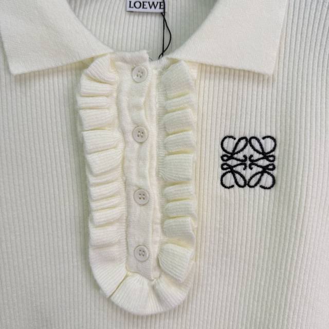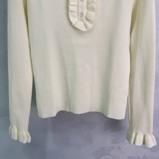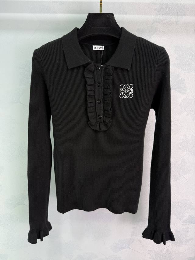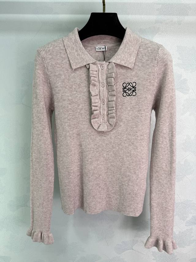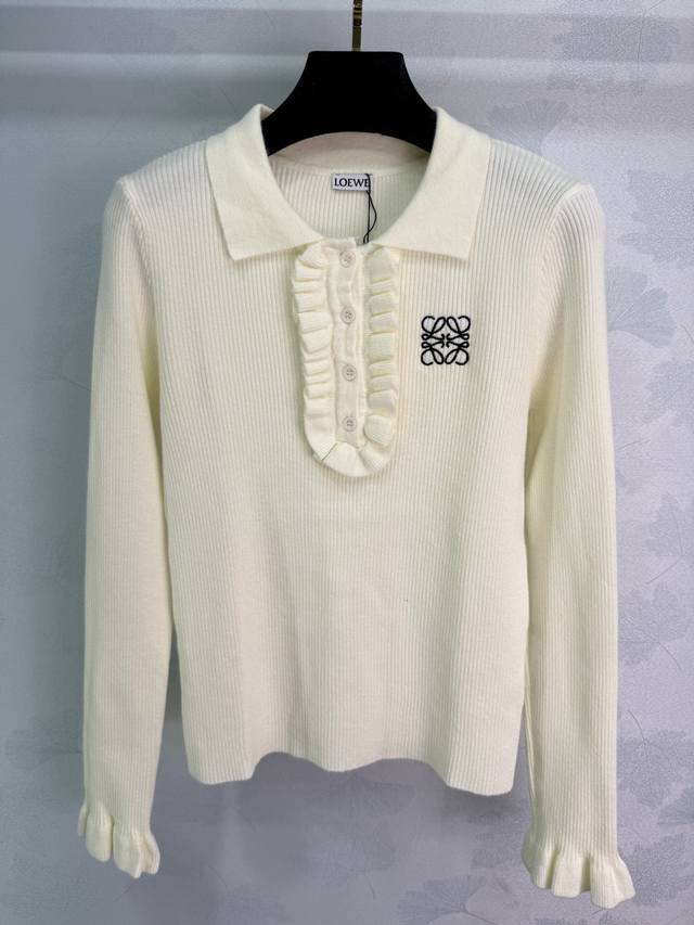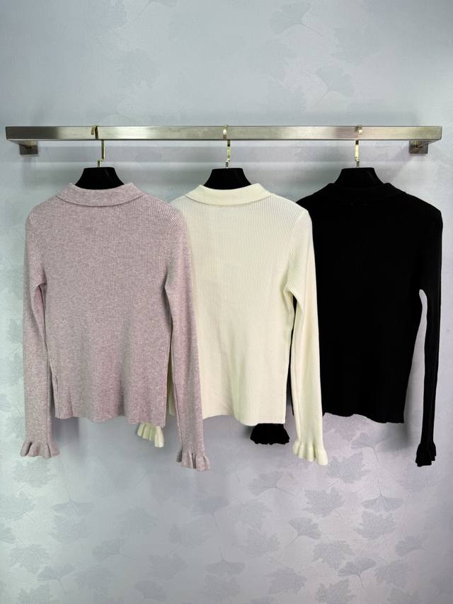 Loe*25 Early Autumn New Collared Knit Sweater. The classic logo embroidery on the chest paired with a ruffled design is incredibly elegant. Made from a high-quality wool blend, it feels exceptionally comfortable. The collar design is unique, and the half-open style is slimming. The cuffs also feature ruffled details. It looks great with skirts or pants! 3 colors, 3 sizes: S, M, L, D, D