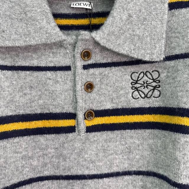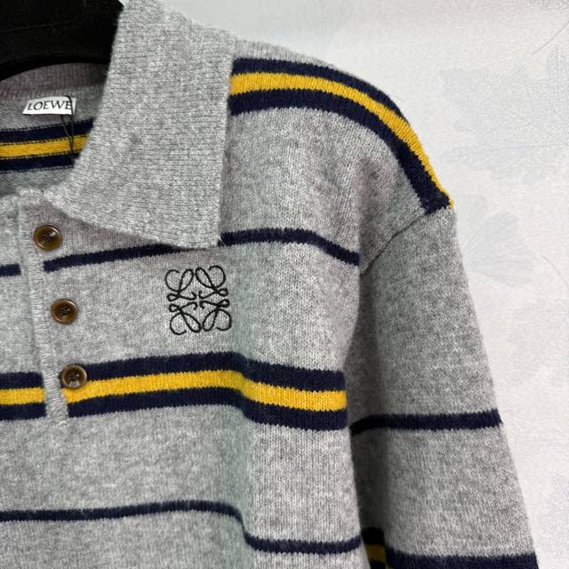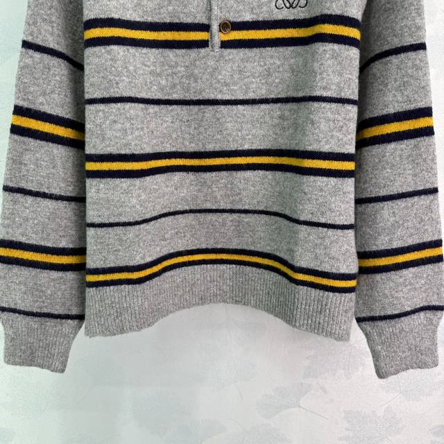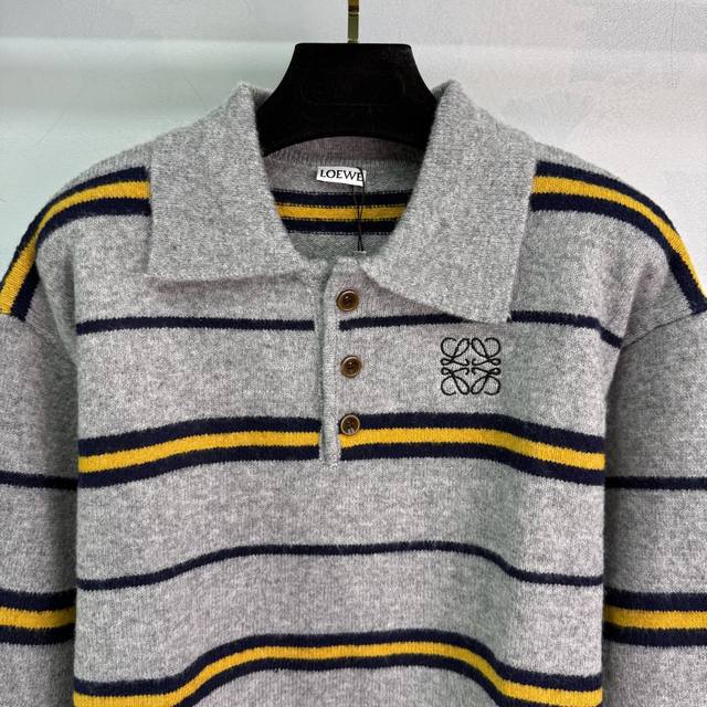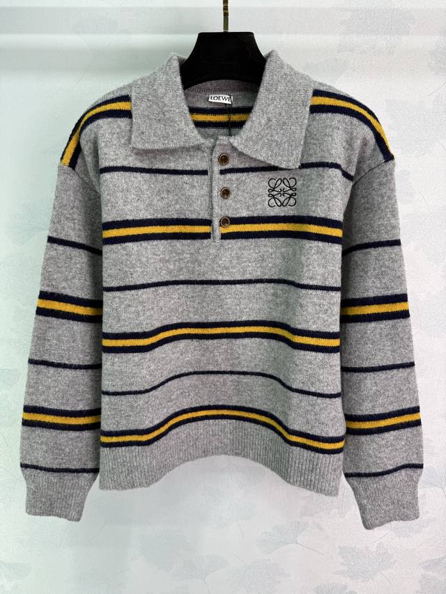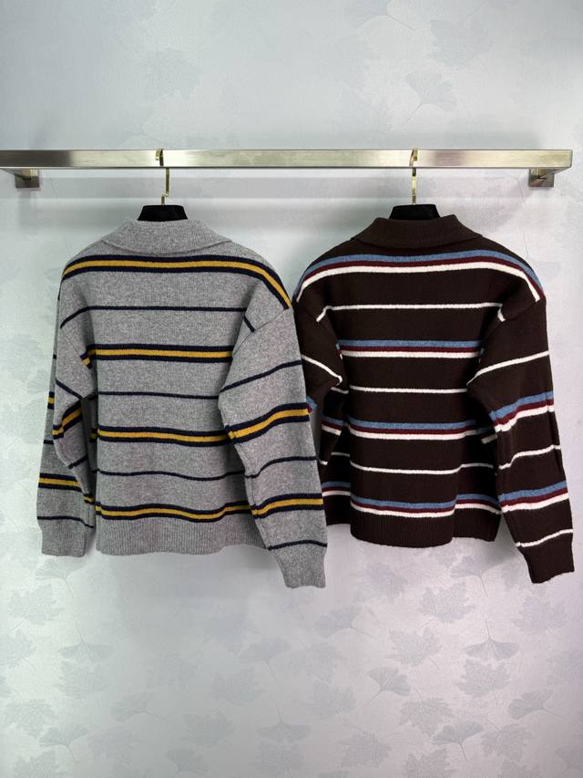Loe*25's new fall/winter striped Polo sweater. Custom-made wool blend fabric, soft and comfortable. Lapel design, chest logo embellishment, simple and elegant. Pairs well with pants or skirts for a versatile fall/winter outfit! 2 colors, 3 sizes. Sml T226B.