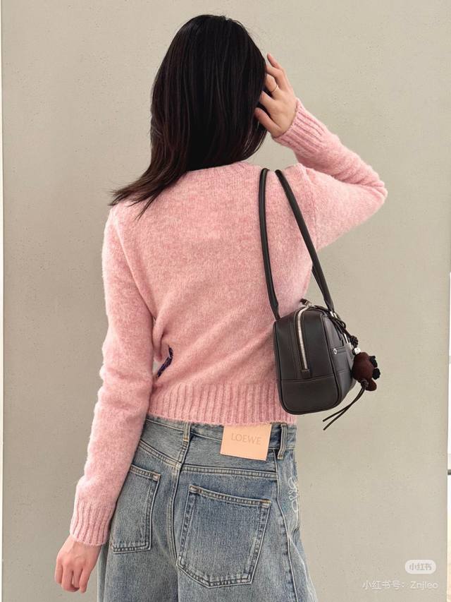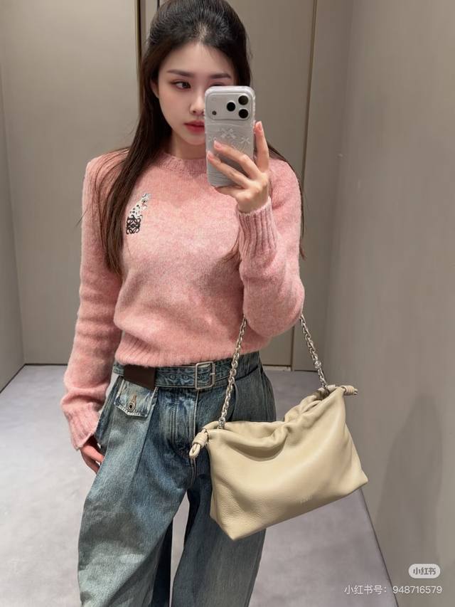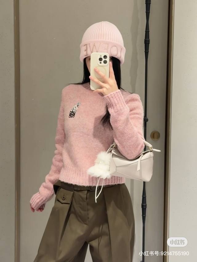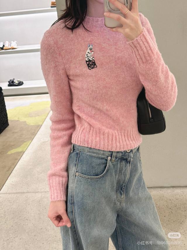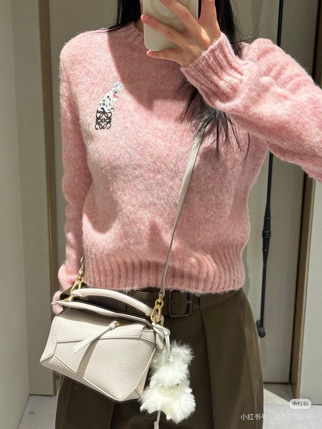 Loew* New high-end custom 100% wool yarn fabric, soft and skin-friendly! Cute and youthful pink embroidered logo cat decoration, round neck pullover long-sleeved knit top! Size M: Bust 92cm, Sleeve Length 57cm, Length 53cm DDD
