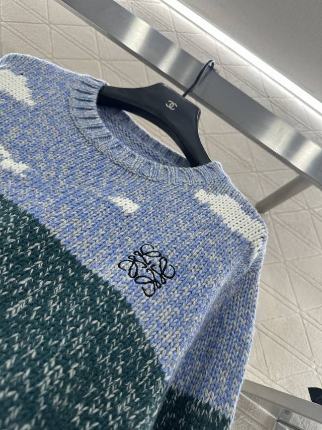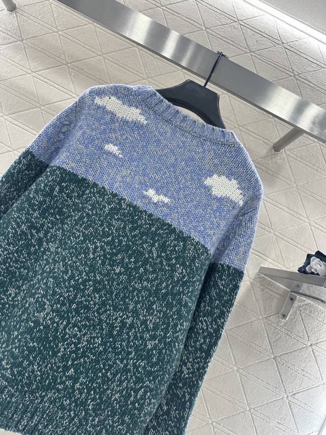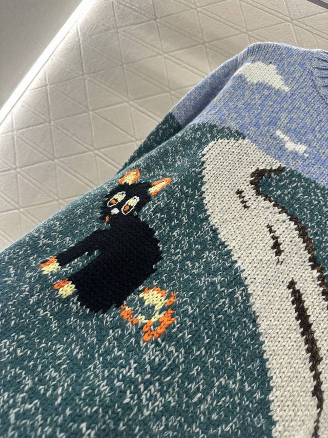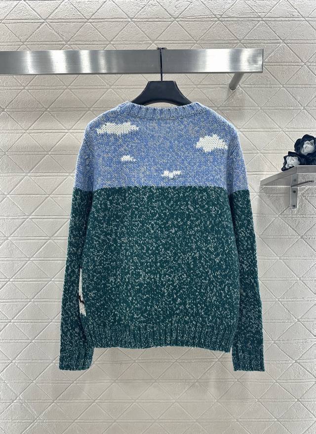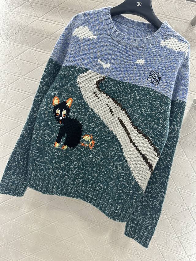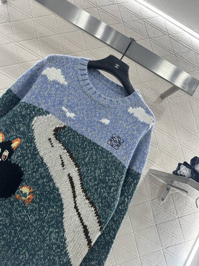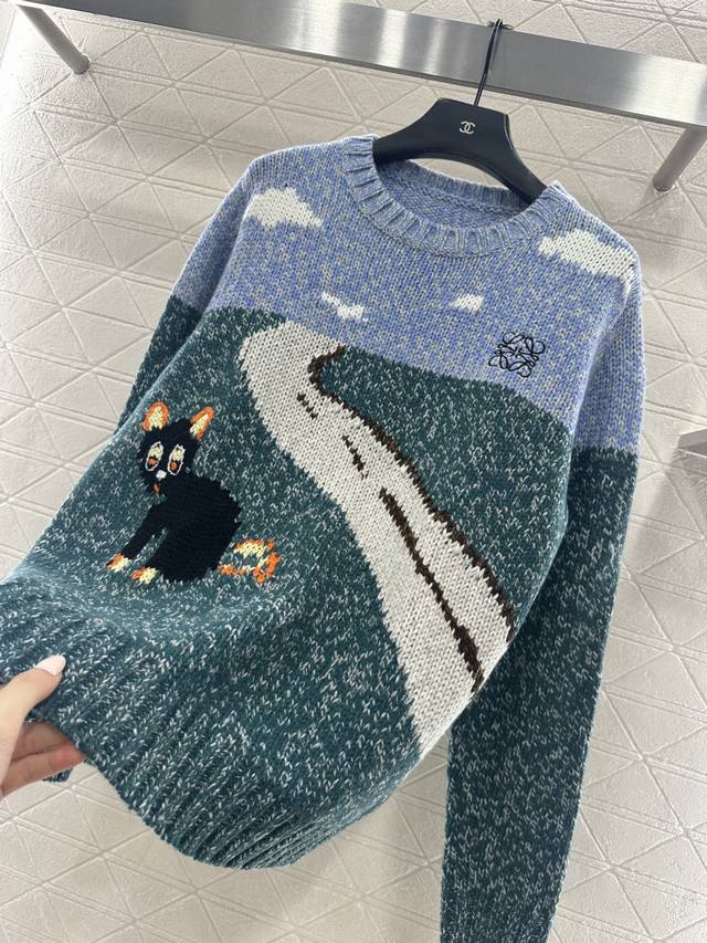 Loew*2025 New Arrival Ddd Crew Neck Playful Graphic Pullover Sweater. Made with custom Yb wool yarn, this sweater boasts a delicate texture, providing comfort and warmth. The crew neck knit sweater features ribbed trim at the neckline, cuffs, and hem, creating a slimming visual effect. The chest is divided horizontally into a blue-green landscape with blue skies, white clouds, and grass, with a central cat and road depicting a scene. The playful graphic style is complemented by a single-sided chest emblem, exuding a fresh and artistic vibe. Custom fabric and accessories, please ensure you choose the high-quality blue-green version. DDD
