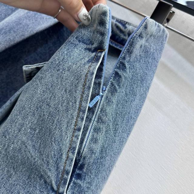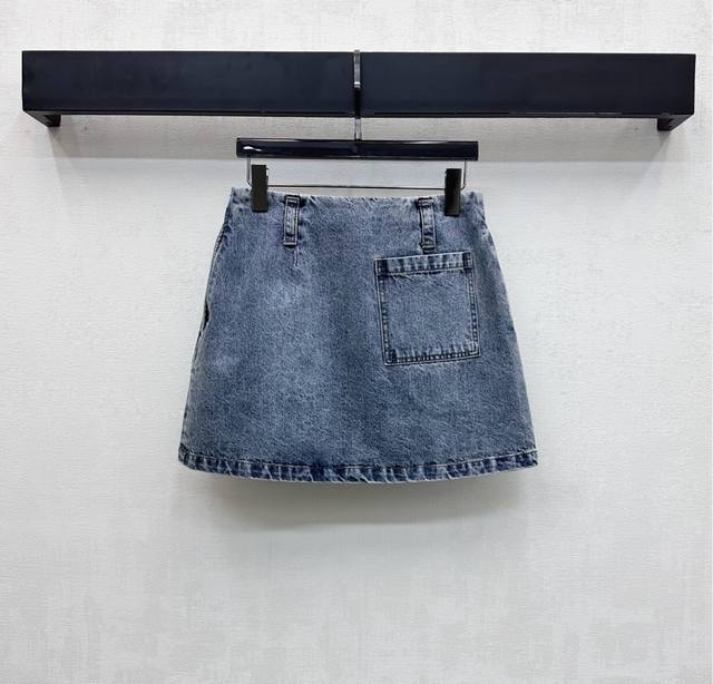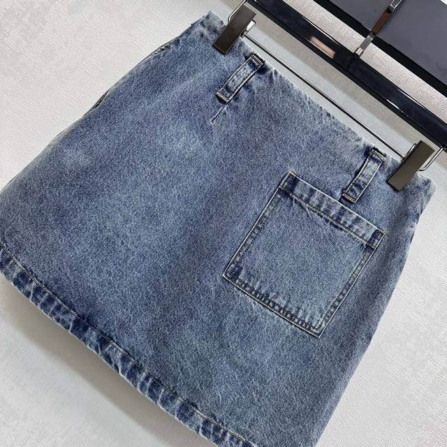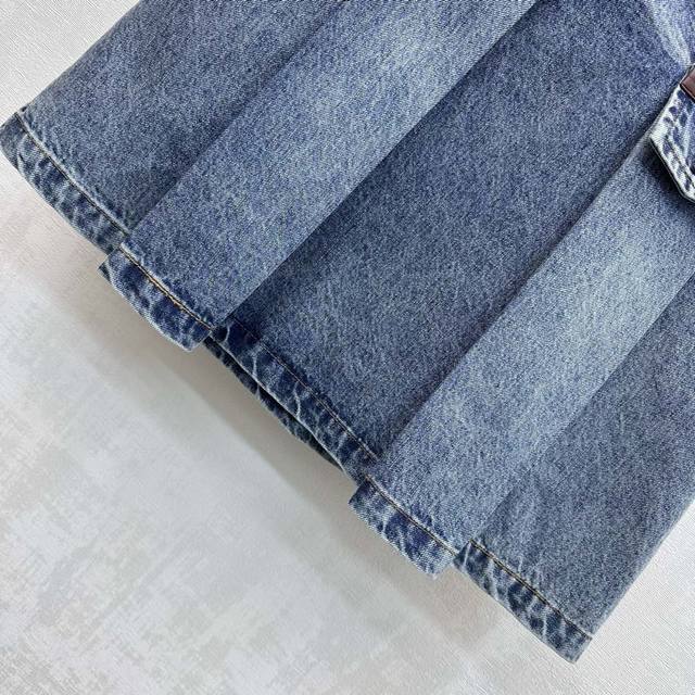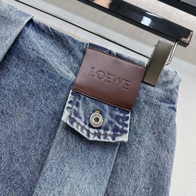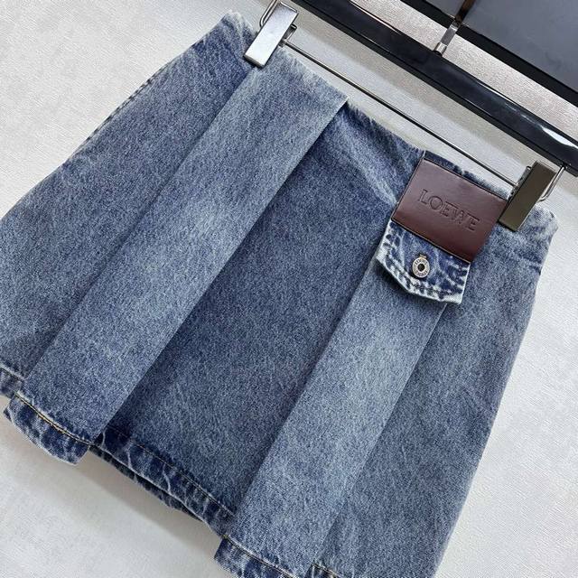 Loew*2025 New Arrival: Leather Label Pleated Denim Midi Skirt, Custom Made with Imported Twill Cotton Denim. The fabric is crisp and stylish with a superior feel. Multiple enzyme washing processes create a vintage look. A single-sided zipper adjustment and pleated front panel add a sense of style. A signature engraved letter leather logo embellishment at the waist highlights the brand's identity. High-waisted A-line midi skirt with a versatile cut, easy to match and stylish. High-end and fashionable. High-quality version.