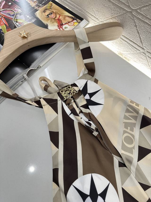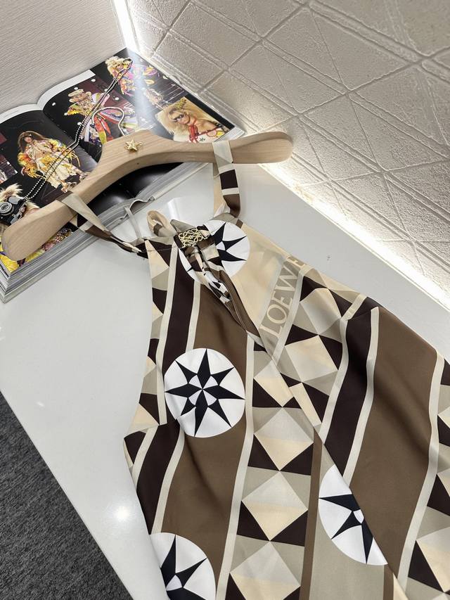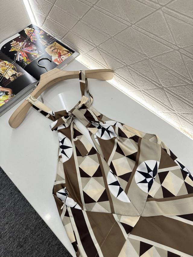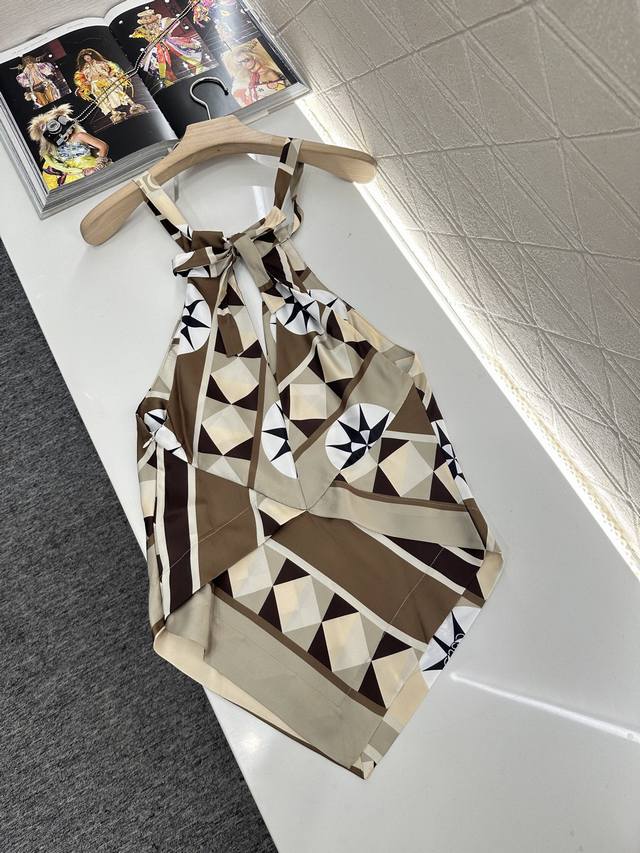 Customized Yb imported twill silk material comfortable, delicate, breathable and easy to wear Halter vest with dark and light brown as the base, decorated with diamond geometric multiple patterns and interspersed letter logos, full of high-end style and ethnic exotic style Halter vest with golden totem hollow decoration to modify the shoulder and neck line The irregular cutting of the inverted triangle at the bottom easily becomes the visual focus, making the collocation more relaxed and fashionable. Customized surface and accessories, look for the high version