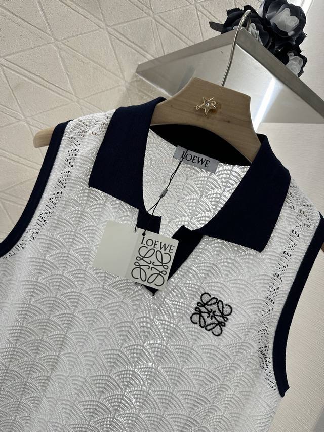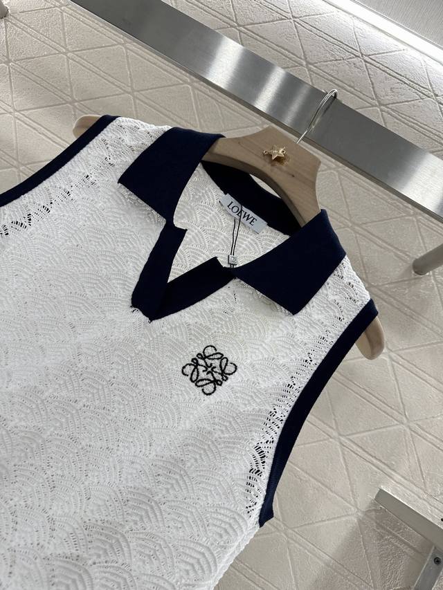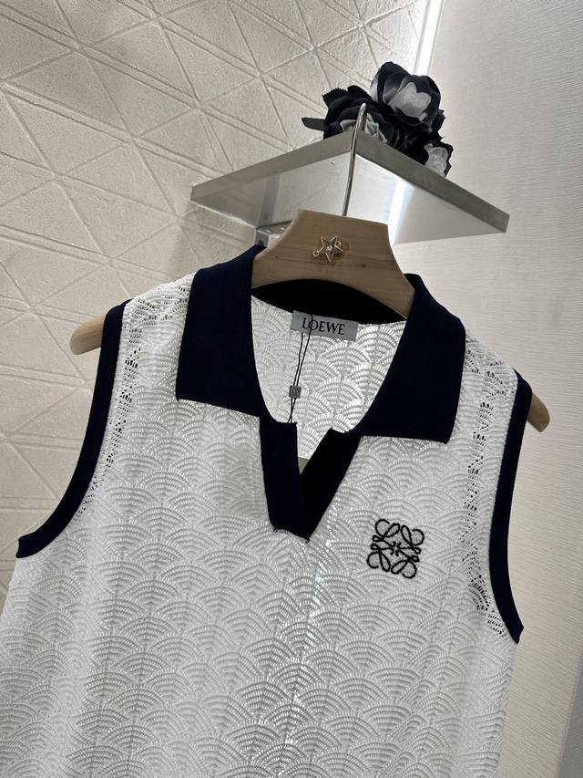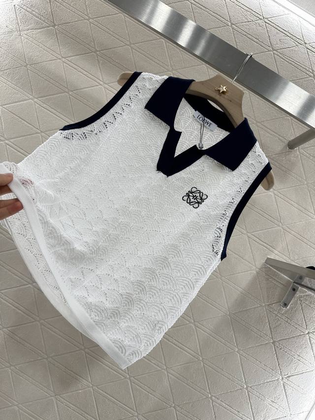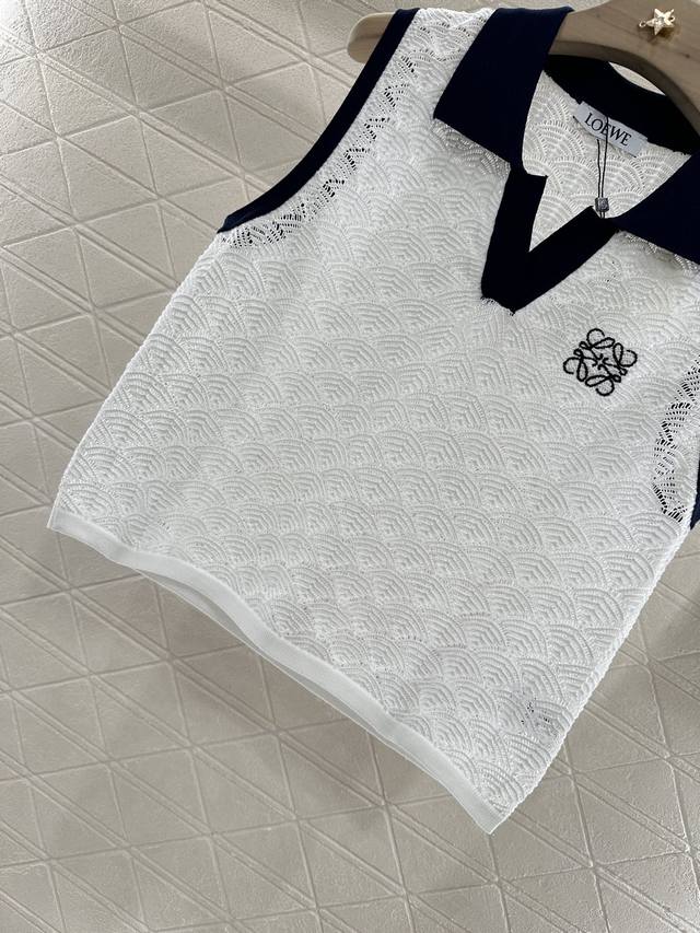 Customized Yb imported yarn woven elastic and comfortable texture Lapel knitted vest cut to show a casual and lazy style of dressing The whole body is delicate and wavy semi-circular patterns overlap slightly transparent hollow and lighter The collar and cuffs have contrasting colors to increase the beauty of dressing High casual feeling It looks good when worn alone or as an inner layer Fashionable The totem logo on the chest highlights the brand style Fashionable and age-reducing Customized surface and accessories Look for the high version 2 colors