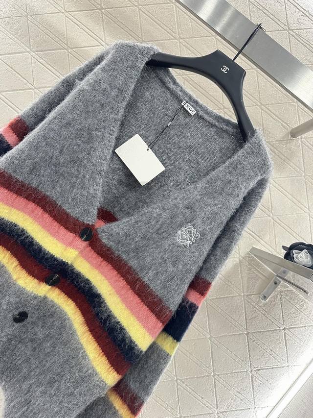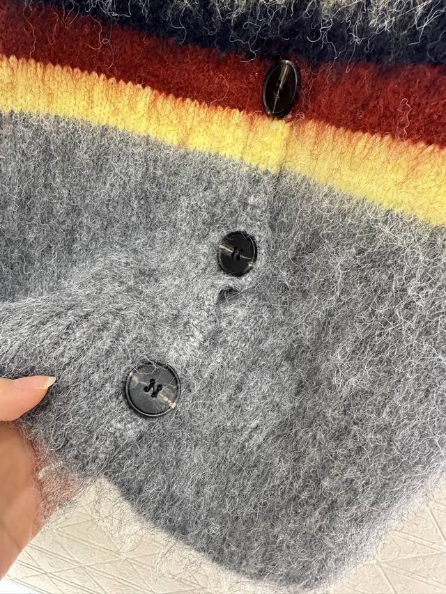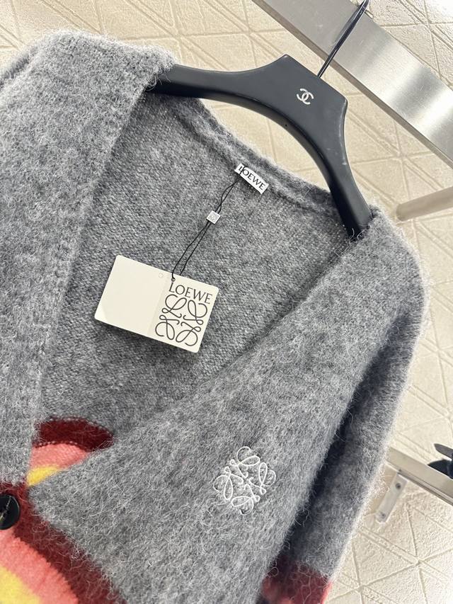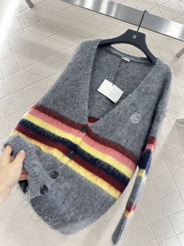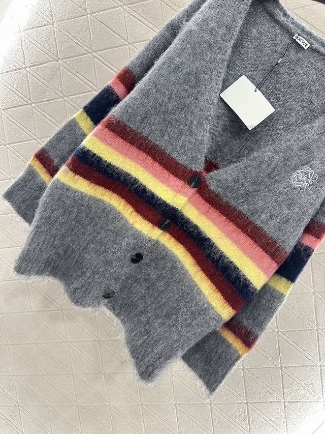 Custom Yb mohair material, high-quality and comfortable to wear, comfortable and not tight. V-neck knitted cardigan with fine stitching and exquisite breathability. Oversized and loose silhouette for a slimming effect. The main color is gray. The buttons extend horizontally to the sleeves. Red and yellow silk crocheted stripes are paired with a totem logo on the chest to highlight the classic and elegant design style. Layering is elegant and charming, and the upper body shows a light luxury and fashionable temperament. Customized fabrics and accessories, look for the high version