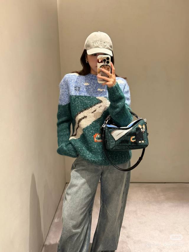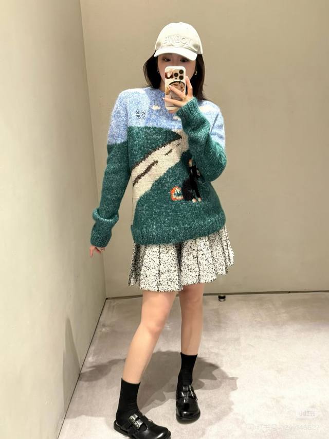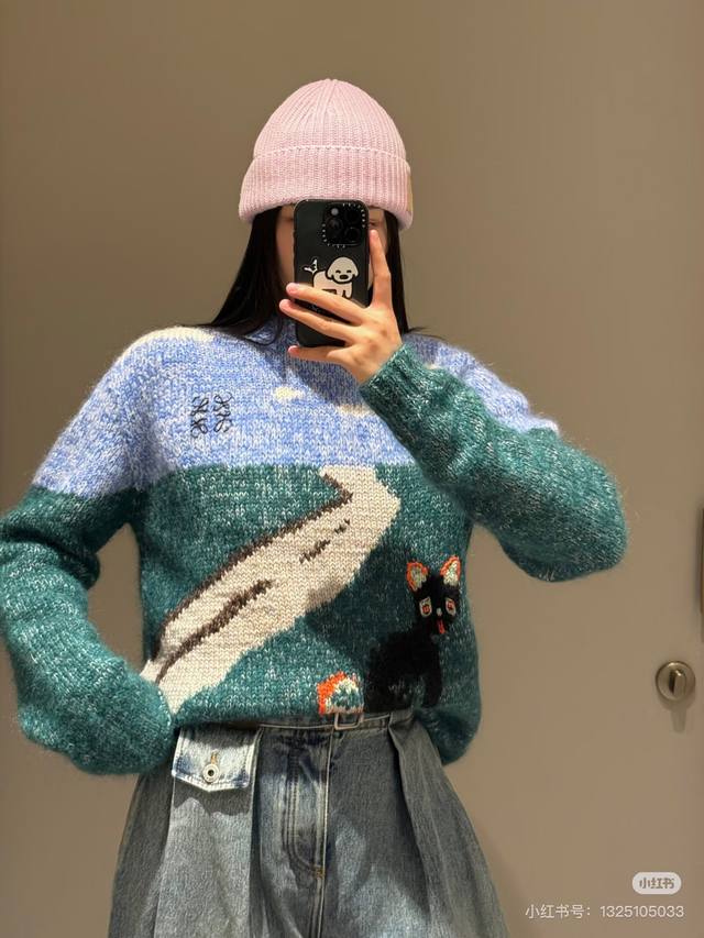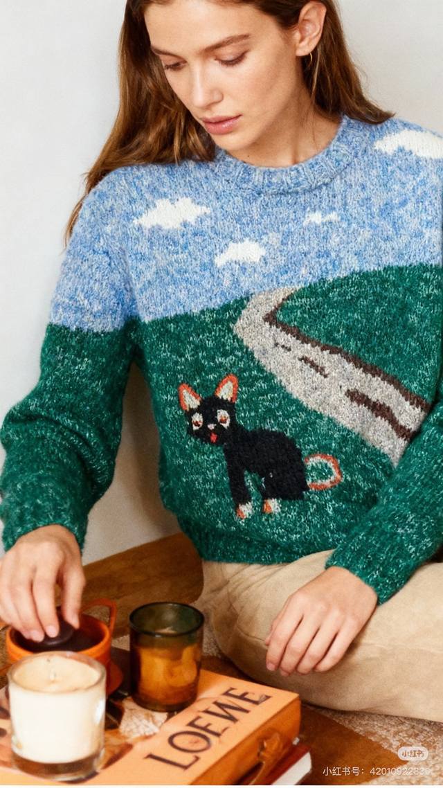 Loew*2026 Early Spring New High-End Custom Cartoon Animation Cat Lawn Pattern Round Neck Pullover Long Sleeve Wool Knit Sweater! Size M: Shoulder Width 42cm, Chest 102cm, Sleeve Length 61cm, Length 59cm DDD