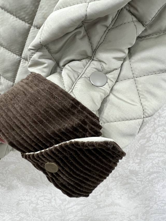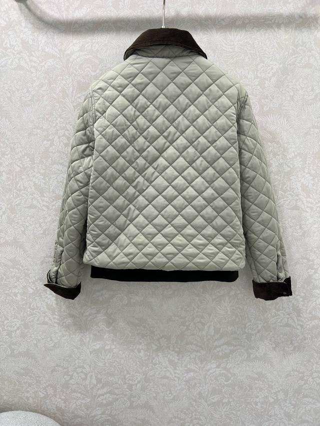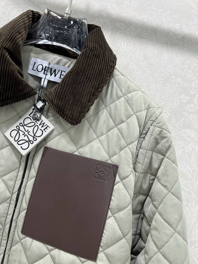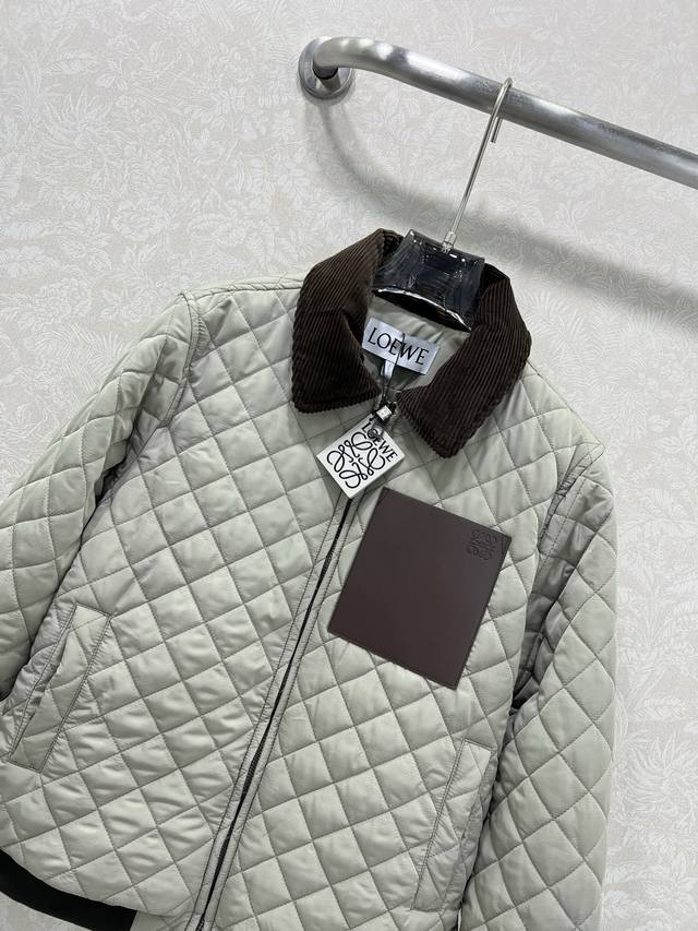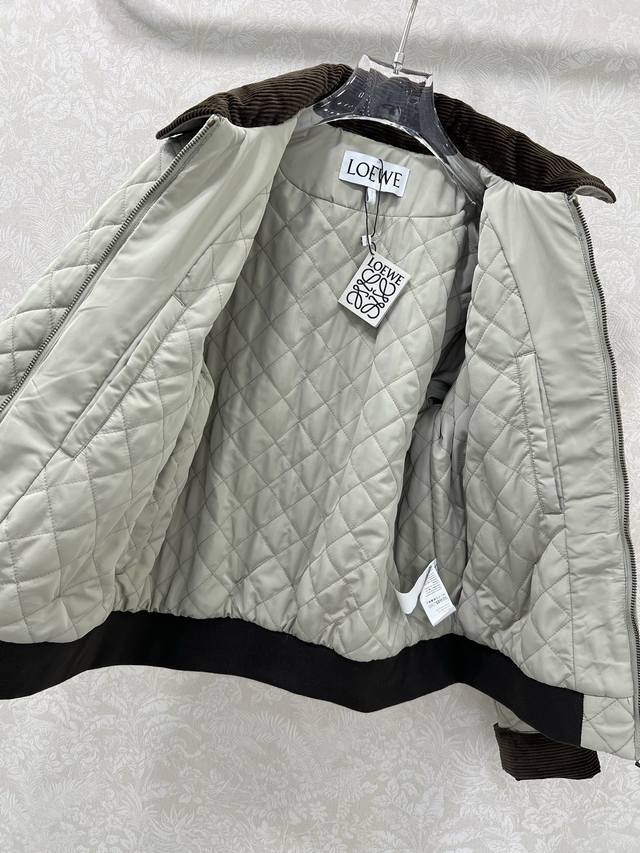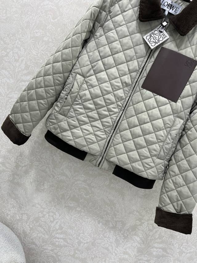 Loew*25 New Diamond Pattern Corduroy Collar Cotton Jacket. The collar and cuffs are made of corduroy fabric. The classic leather logo on the chest adds a touch of sophistication. The ribbed knit hem adds visual interest and prevents the jacket from looking bulky. It has a casual and cool vibe, perfect for everyday wear. Easily achieve a sweet and cool girl look. 2 colors, 3 sizes. Smlb. DDD