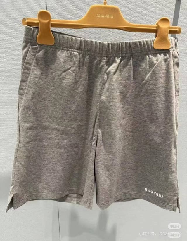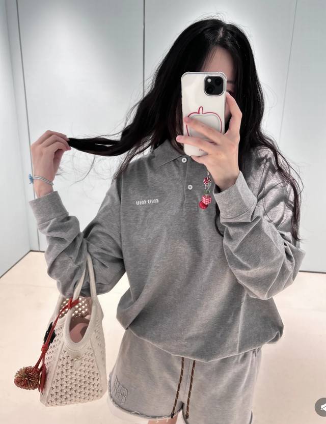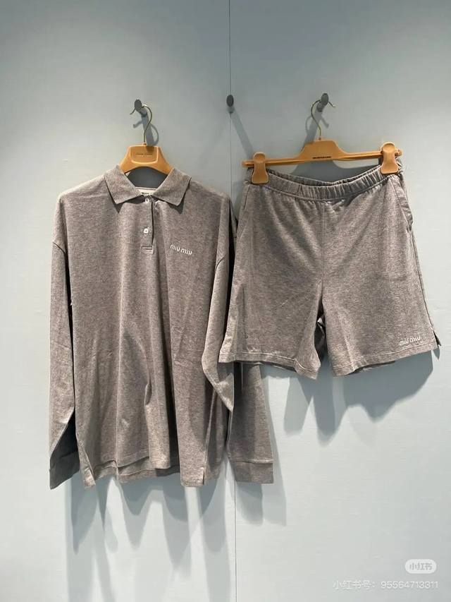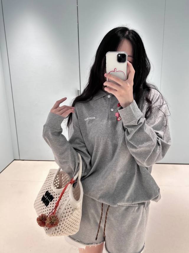 Long-sleeved shorts Miumi* 25Fw Early Fall new micro-embroidered cotton long-sleeved polo shirt and shorts. Original development! High-quality product! Gray cotton silk-cotton fabric with brand logo embroidery. Polo collar with button closure. Loose stretch fit. Unisex and casual, versatile. In stock. Sml