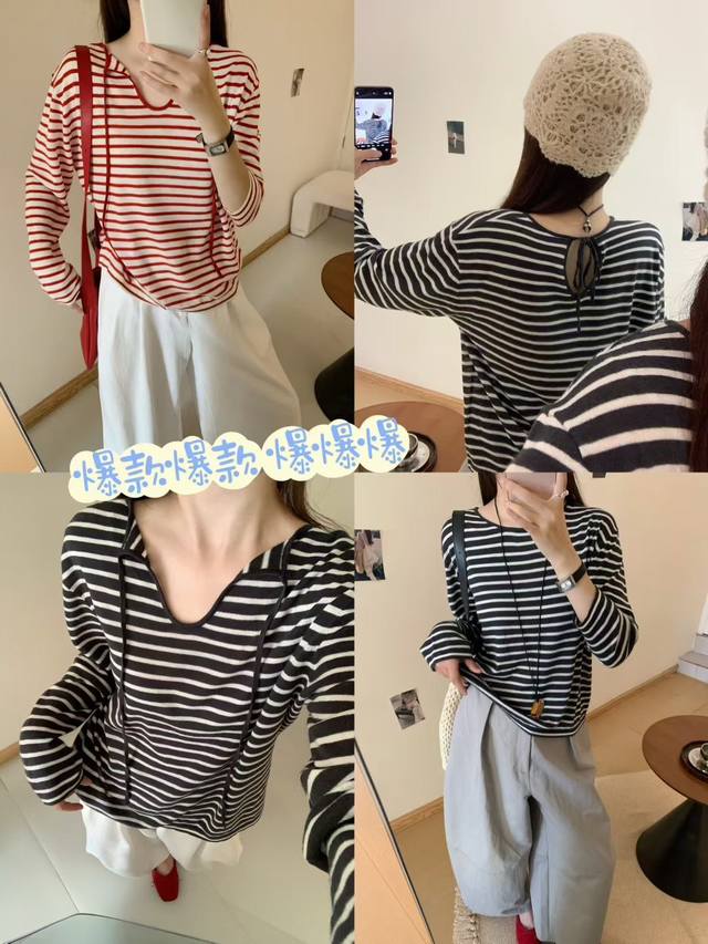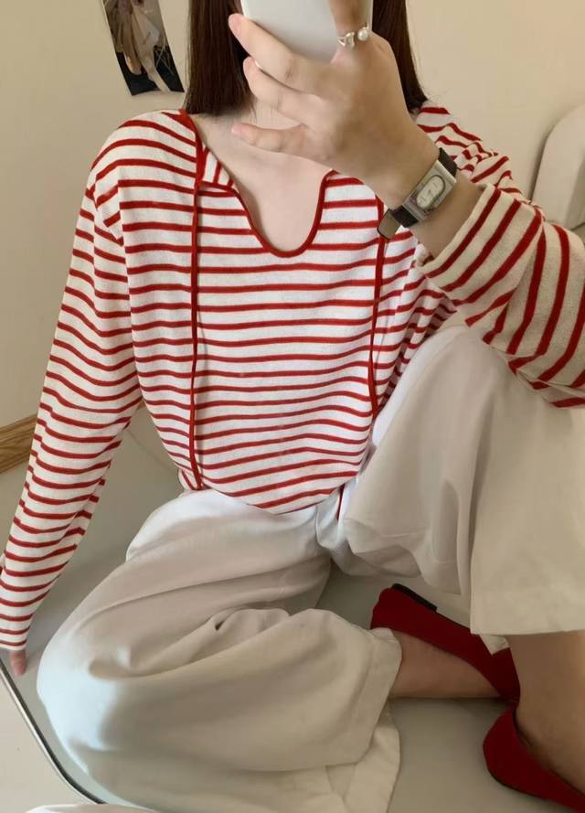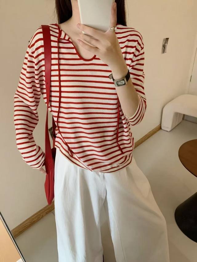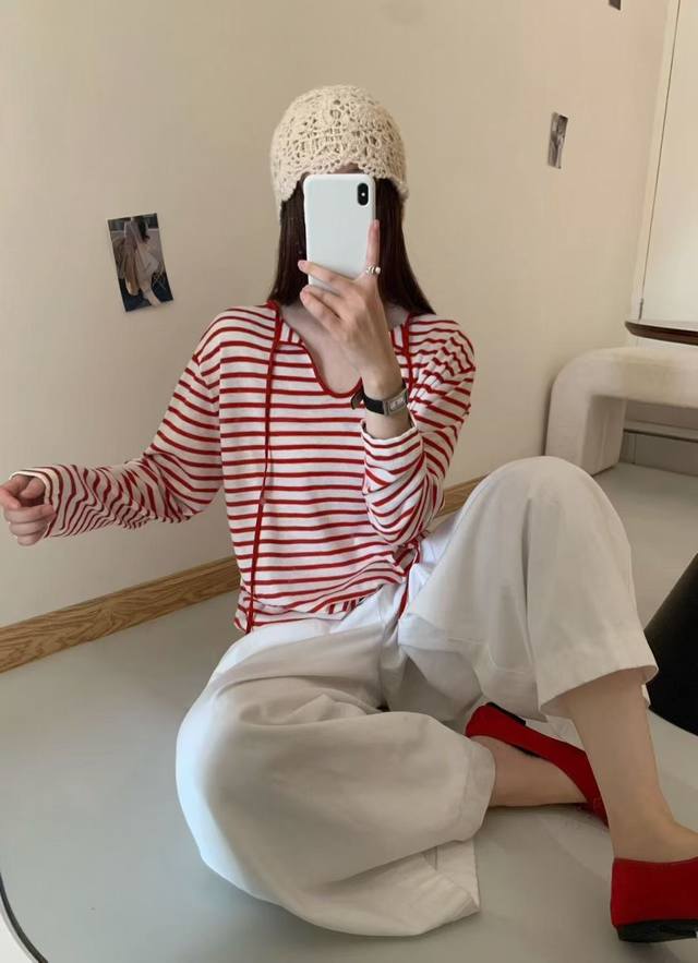 Loose feeling Tencel striped lace-up T-shirt loose drape small V-neck long sleeve