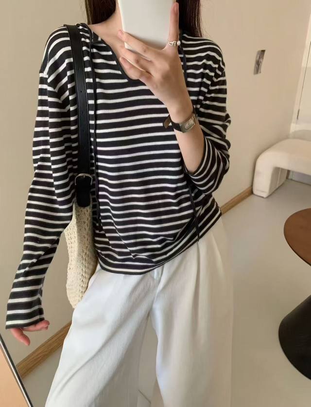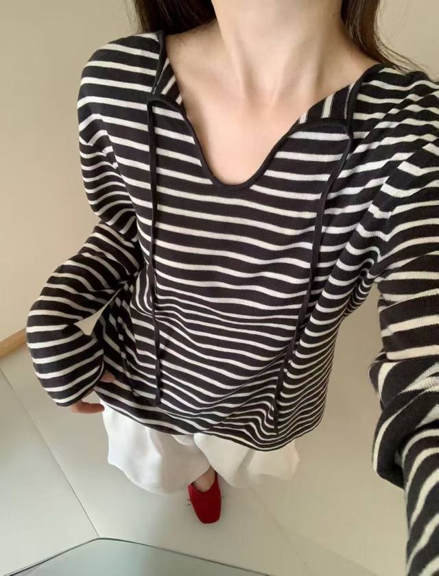 / Loose feeling Tencel striped lace-up T-shirt loose drape small V-neck long slee