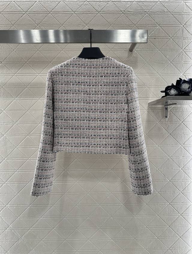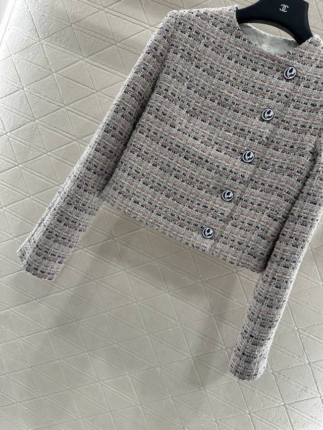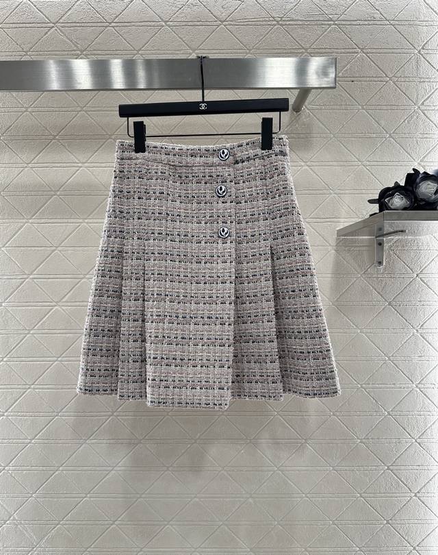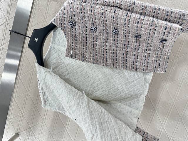 Round-Neck, Slanted-Breasted Dress with Pleated Miniskirt Set. Made from custom Yb imported wool tweed, this round-neck dress features a jacket with straight shoulders and padded shoulders, creating a slim, upright silhouette. Woven patterns throughout enhance the look, creating a refined, ladylike vibe. The slanted-breasted design is a unique accent, complemented by printed floral buttons for a striking finish. Paired with the matching miniskirt, the pleated hem and sleek, pressed-pleat, slanted-breasted button detail create a perfect, elegant look. This set, in pure white, exudes elegance, refined sophistication, and a gentle, sensual touch. Perfect for formal occasions, this custom-made fabric and accessories are available in the high-quality, two-color skirt and jacket.