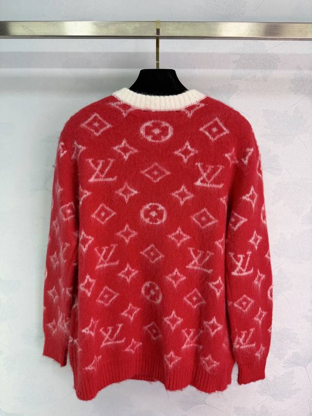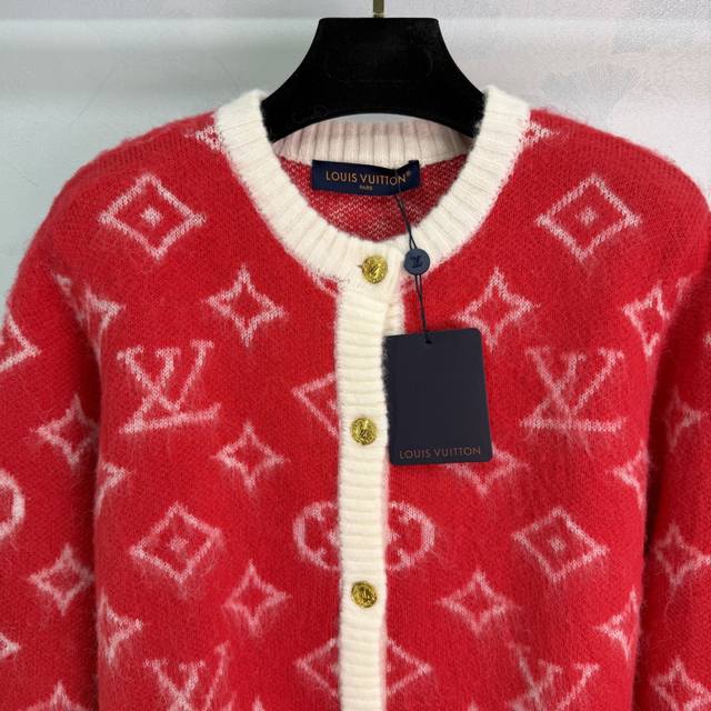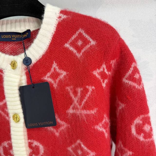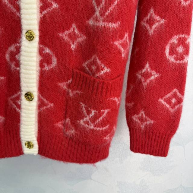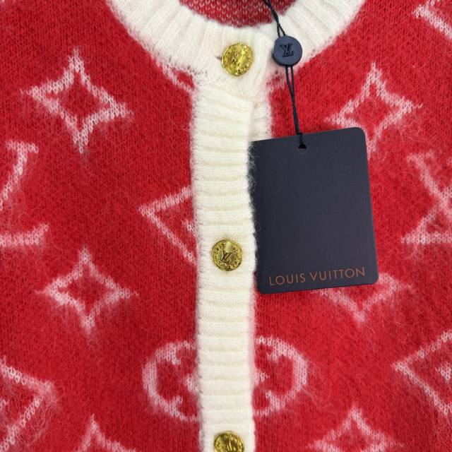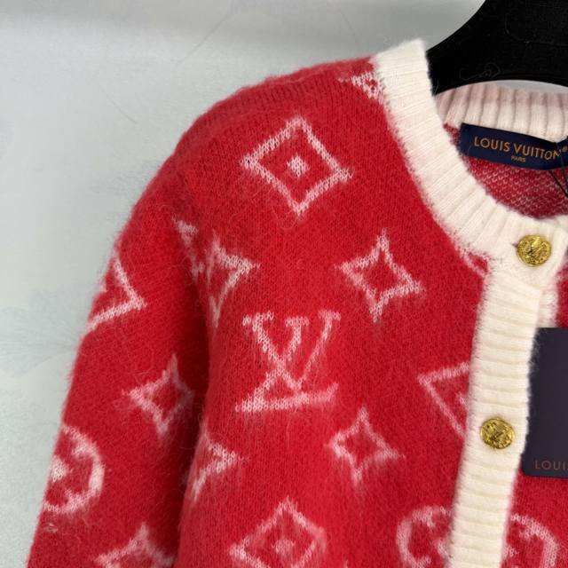 Lou*25 Autumn/Winter New Monogram Knit Cardigan. The classic monogram pattern is highly recognizable, featuring a red base with white trim and gold button accents