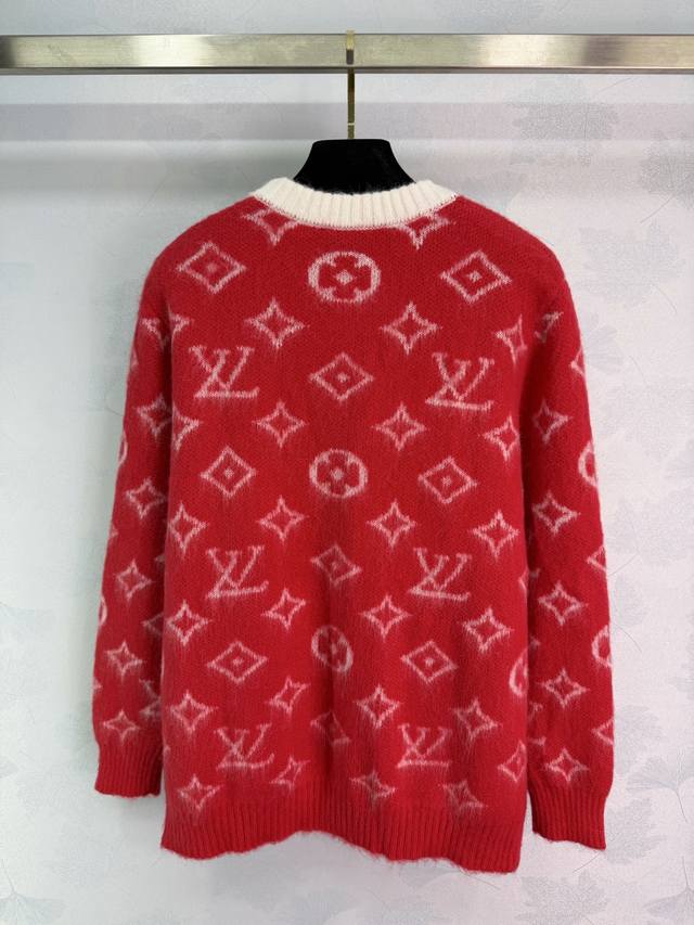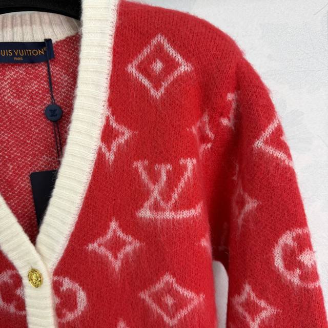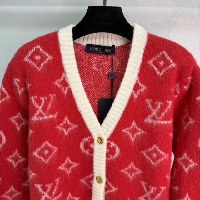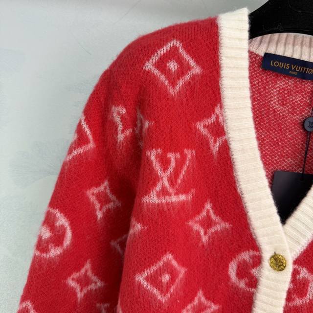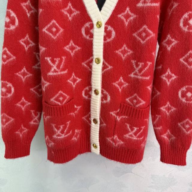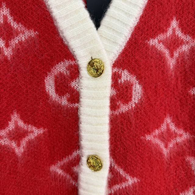 Lou*25 Autumn/Winter New Monogram Knit Cardigan. The classic monogram pattern is highly recognizable, featuring a red base with white trim and gold buttons for exquisite detail. Made from a high-quality wool blend, it's soft and warm. It has two front pockets for practicality and style, perfect for casual wear or layering with skirts, effortlessly creating an elegant and relaxed look. Available in 1 color and 3 sizes: S, M, L, T226B. DDD