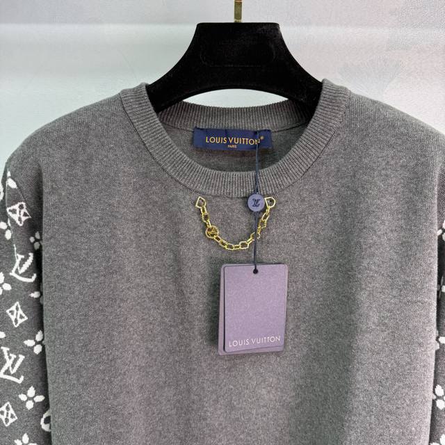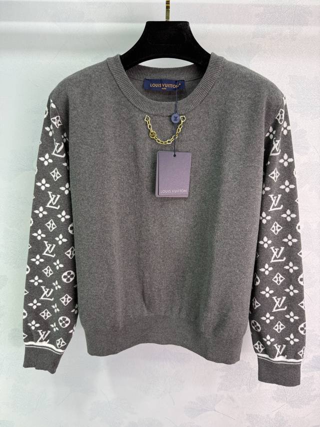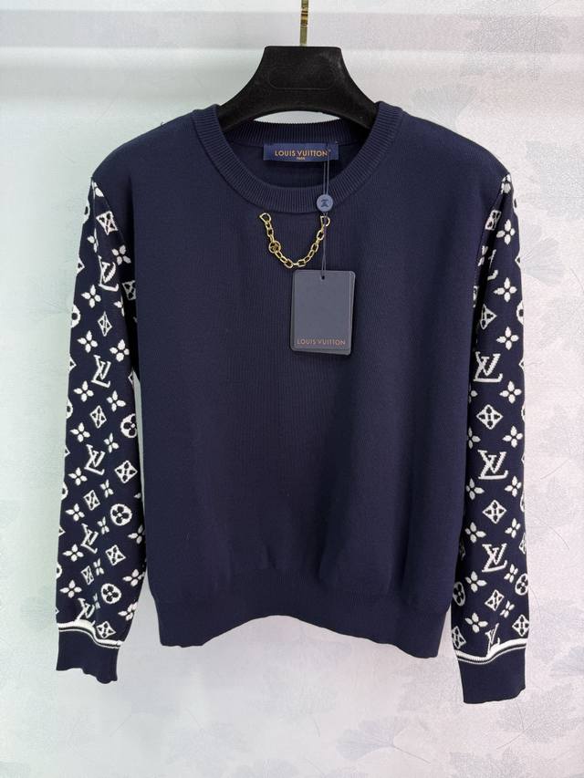 Lou*25's new early fall classic floral sleeve knit sweater features a gold chain detail on the chest. The sleeves are printed with the brand's logo, creating a stylish round neckline and a pullover design that exudes a touch of luxury and chic. Available in two colors and three sizes (Sml T226B.