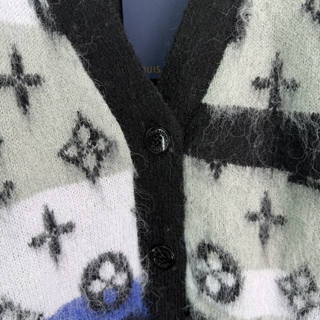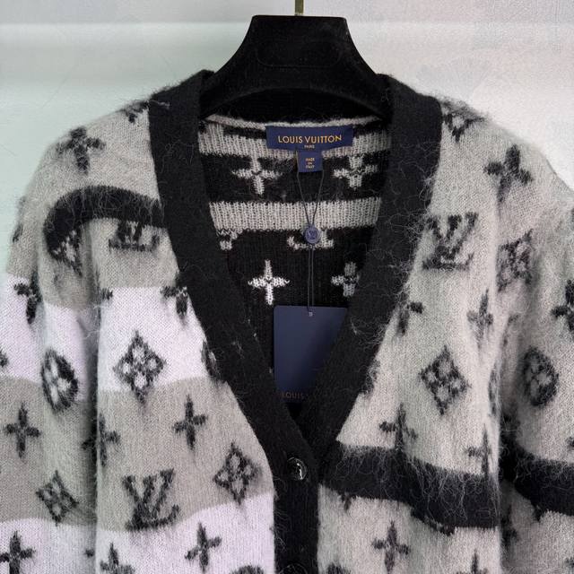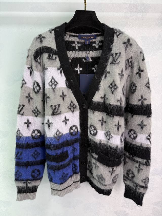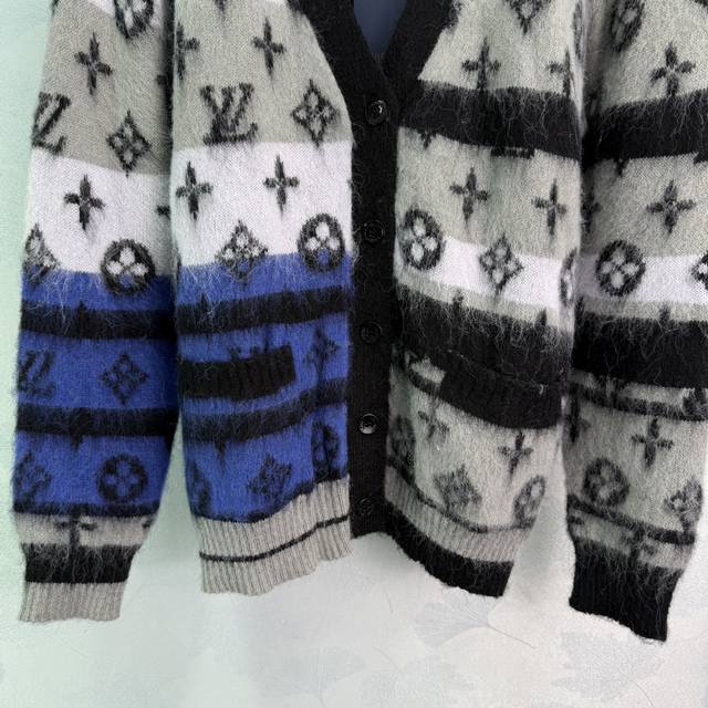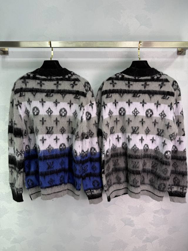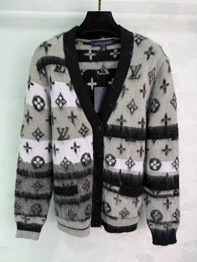 Lou*'s new mohair knitted cardigan for early fall 2025! Custom-made from imported mohair, the mohair texture is incredibly comfortable to wear. The loose fit is paired with a fashionable, stylish gradient monogram pattern. The custom-dyed contrasting colors create a unique and sophisticated look. The various shades of monogram pattern create a vibrant, sophisticated look. This stylish cardigan is a must-have for everyday wear, whether worn alone or with a fall or winter outfit. It's a perfect match for both men and women, perfect for couples, and stylish! Available in 2 colors and 3 sizes. Sml T226B.