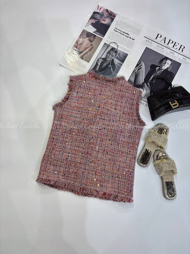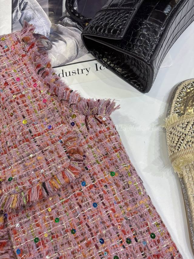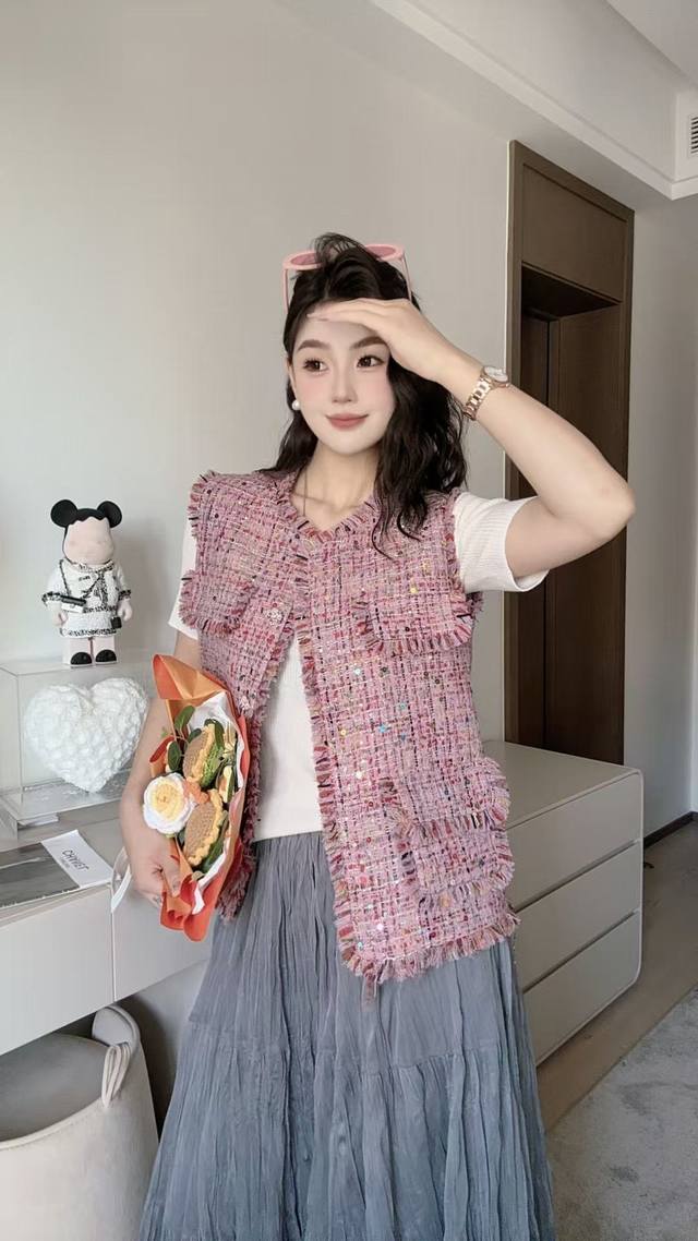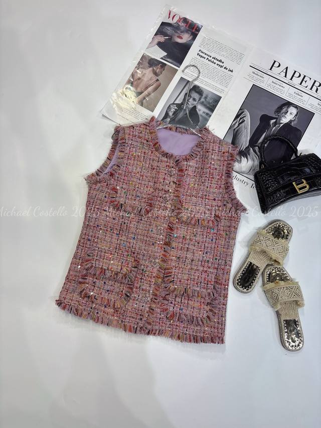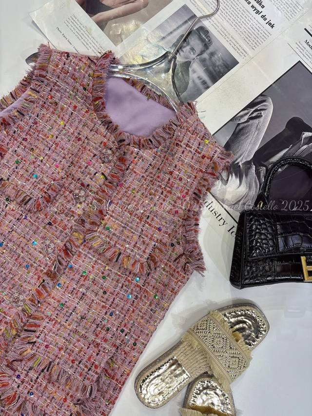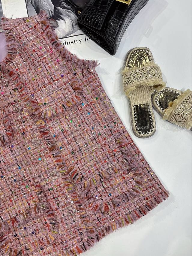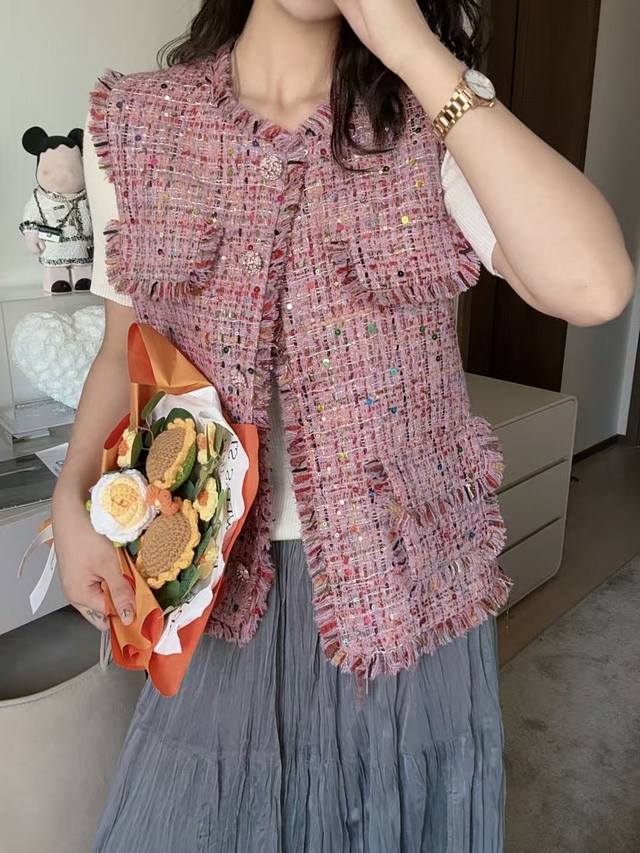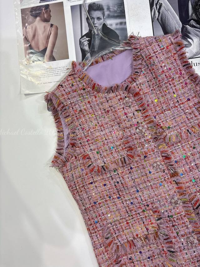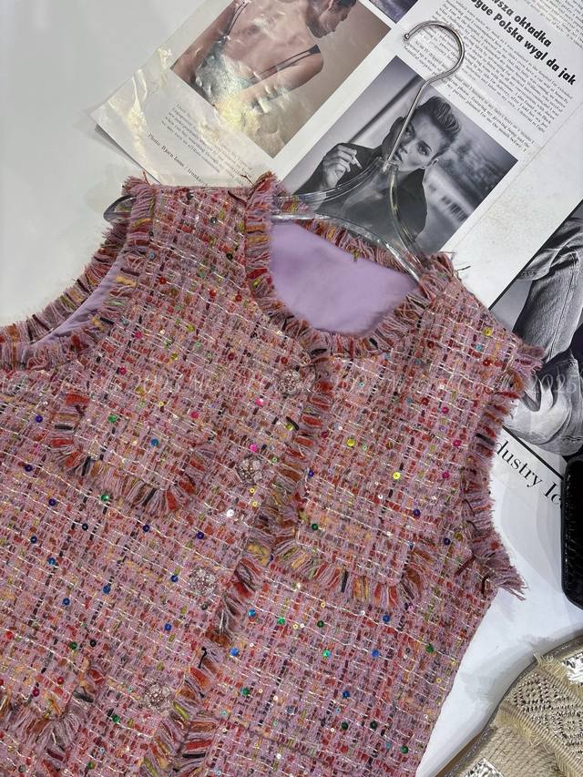 Luxury, elegant, and beautiful. This Chanel vest is full of girlish charm. The gentle and sweet pink color weaves a romantic dream. The delicate sequins and colorful silk threads are interwoven, just like the scattered stars, gently swaying with the steps. The exquisite tassel edge design Smlxl